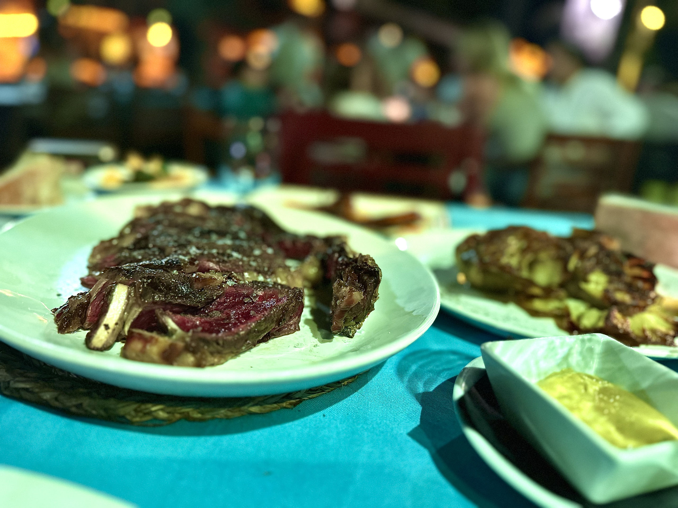 En Trocadero Arena se sirve producto de calidad, lo comprobamos con un magnífico chuletón Discarlux al carbón, acompañado de unas adictivas patatas fritas, alcachofas a la parrilla y unos muy buenos pimientos asados.