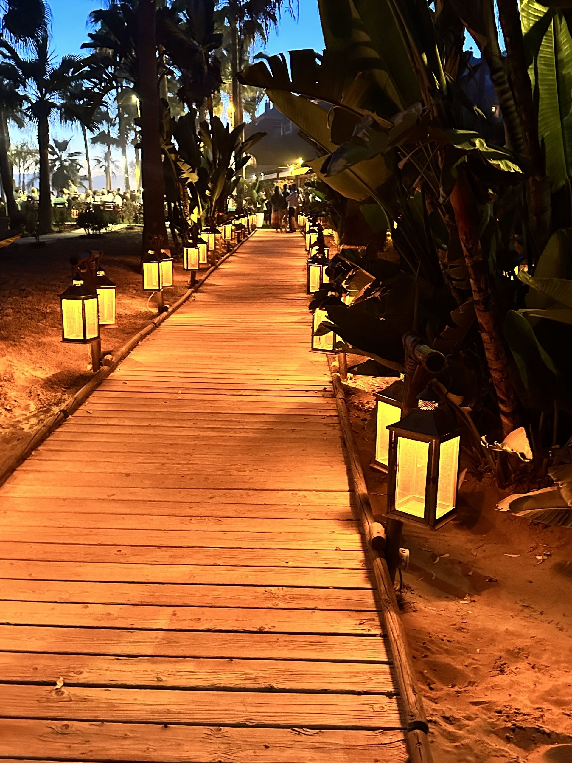 La icónica entrada de Trocadero Arena, perfectamente iluminada que te llevará a su estupenda terraza y al restaurante del chiringuito.