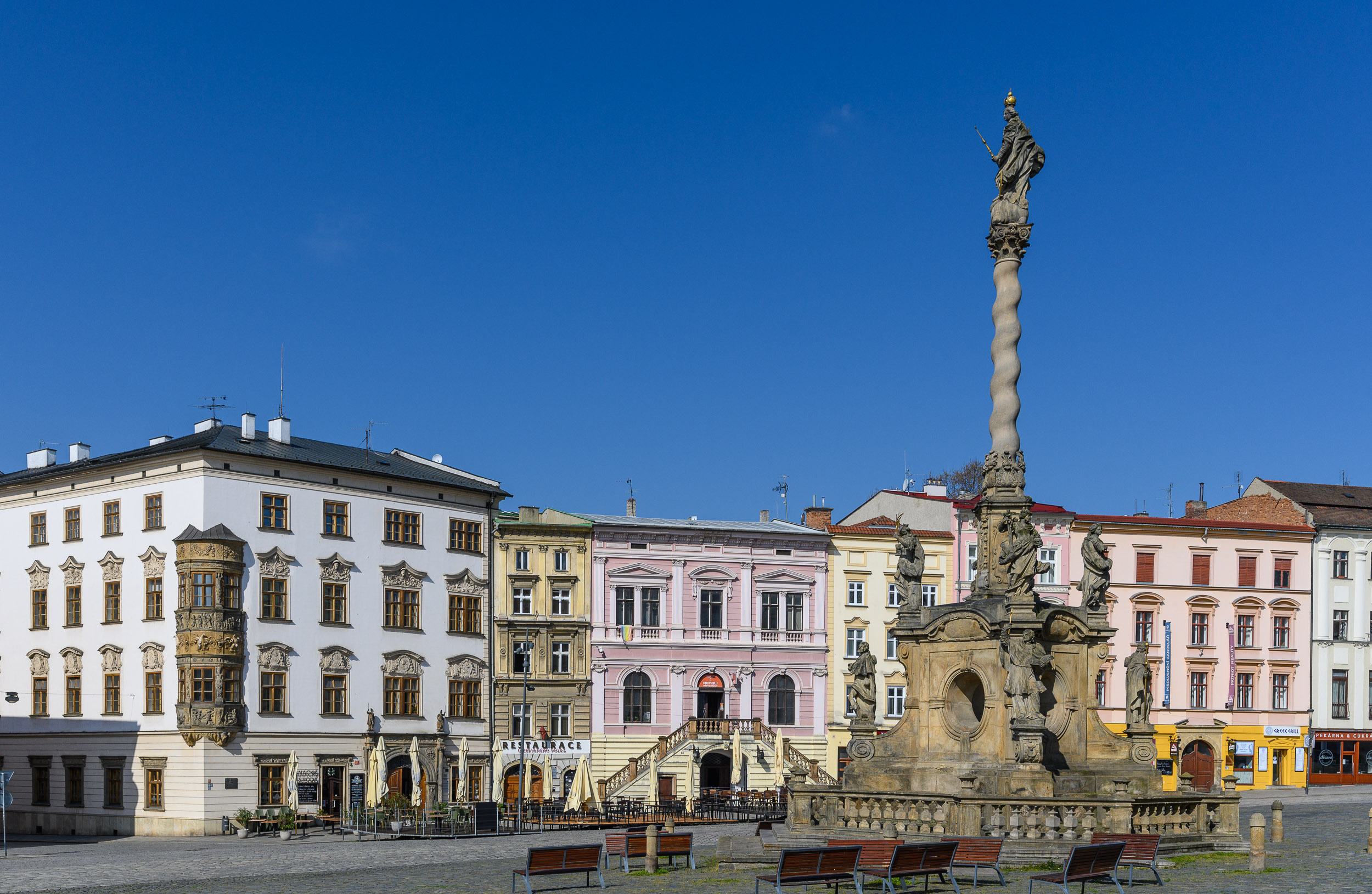 La plaza Inferior de Olomouc tiene una columna de la peste y un edificio, el blanco a la izquierda, en el que vivió Mozart.