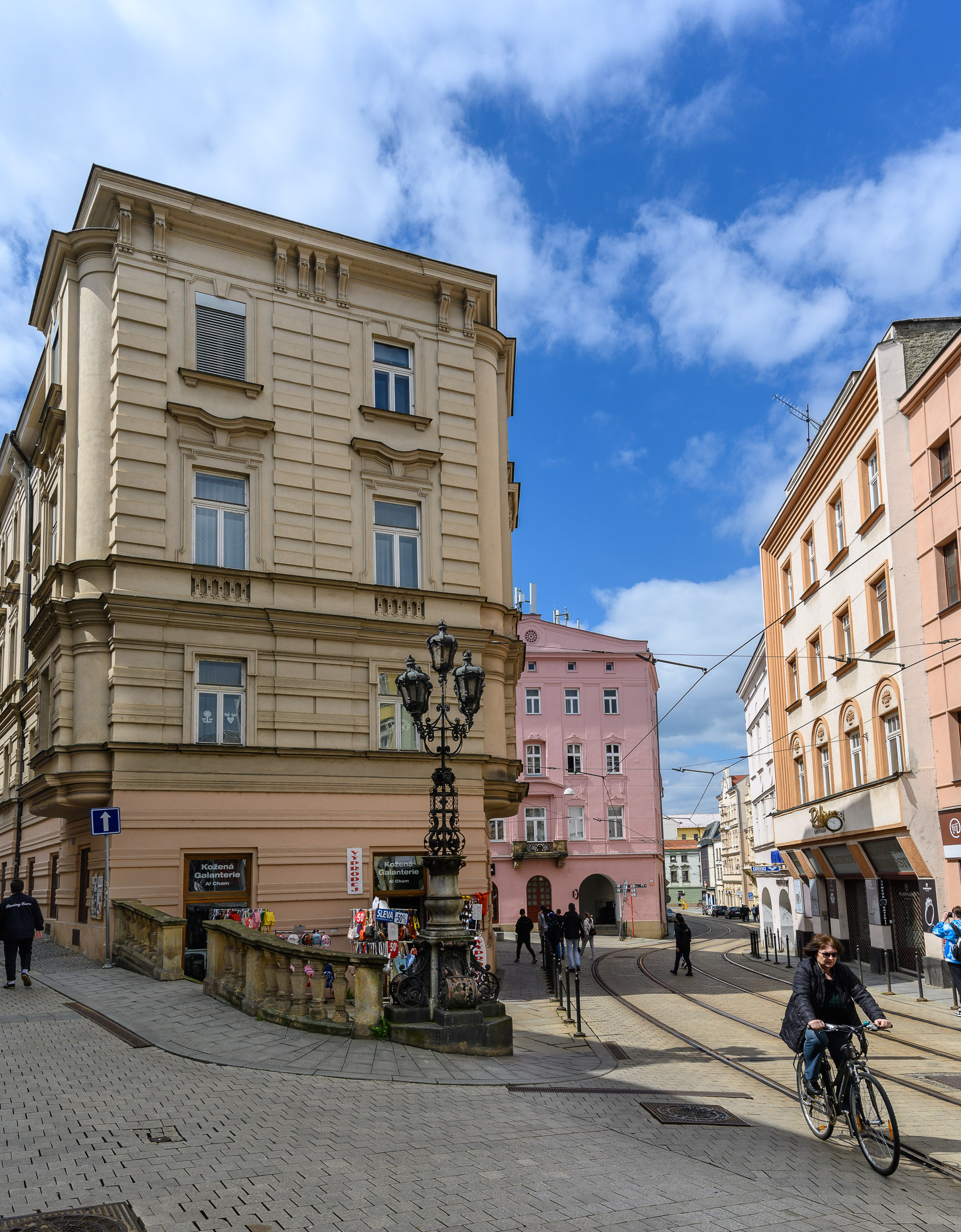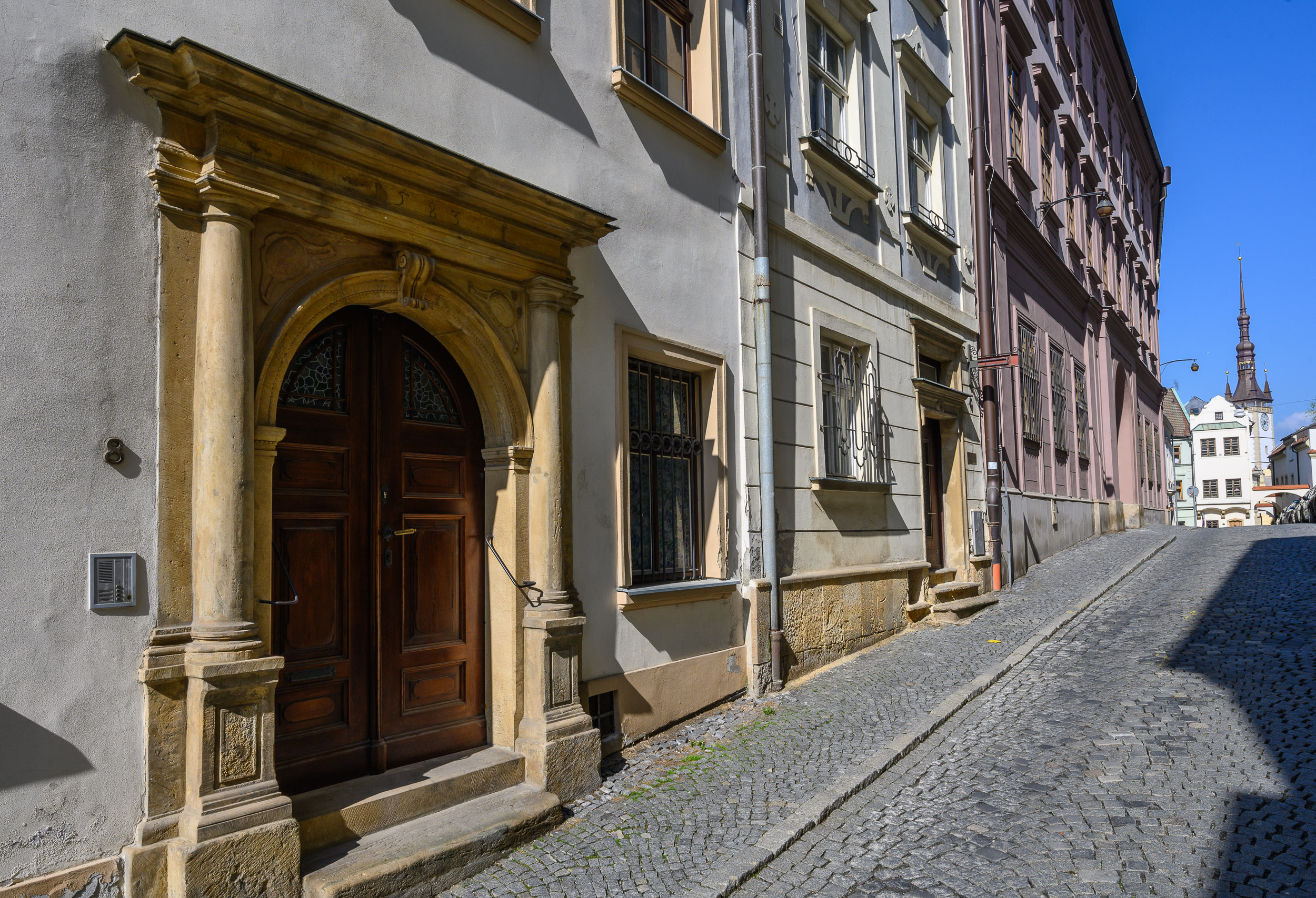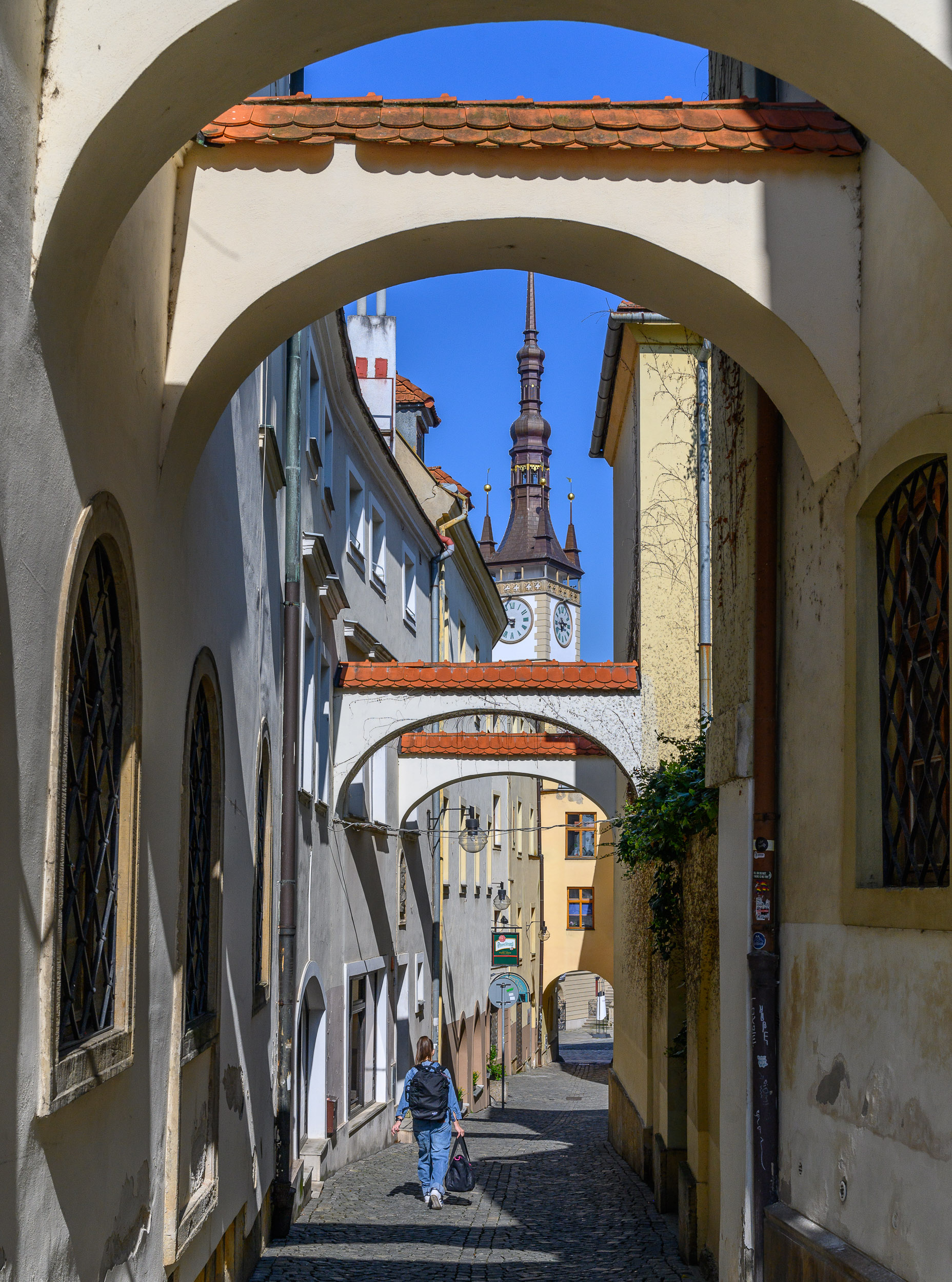 Una curiosa calle de Olomouc, con la torre del Ayuntamiento al fondo.