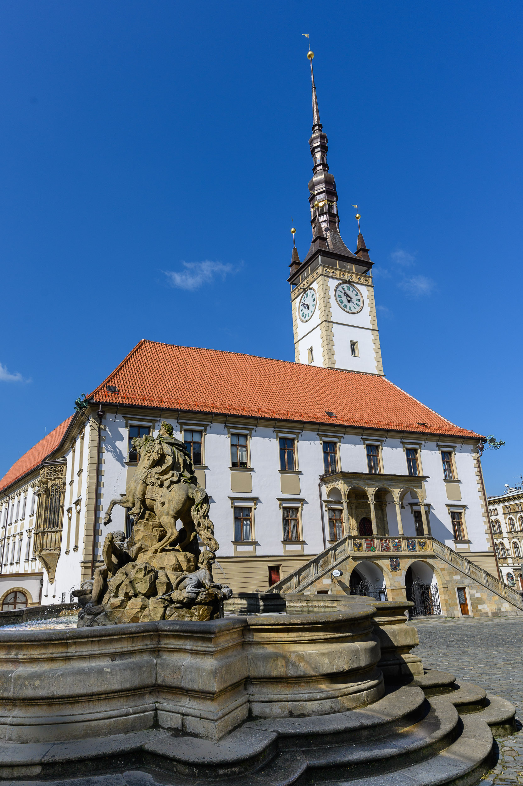La fachada renacentista del Ayuntamiento de Olomouc y una de las muchas fuentes de la ciudad.