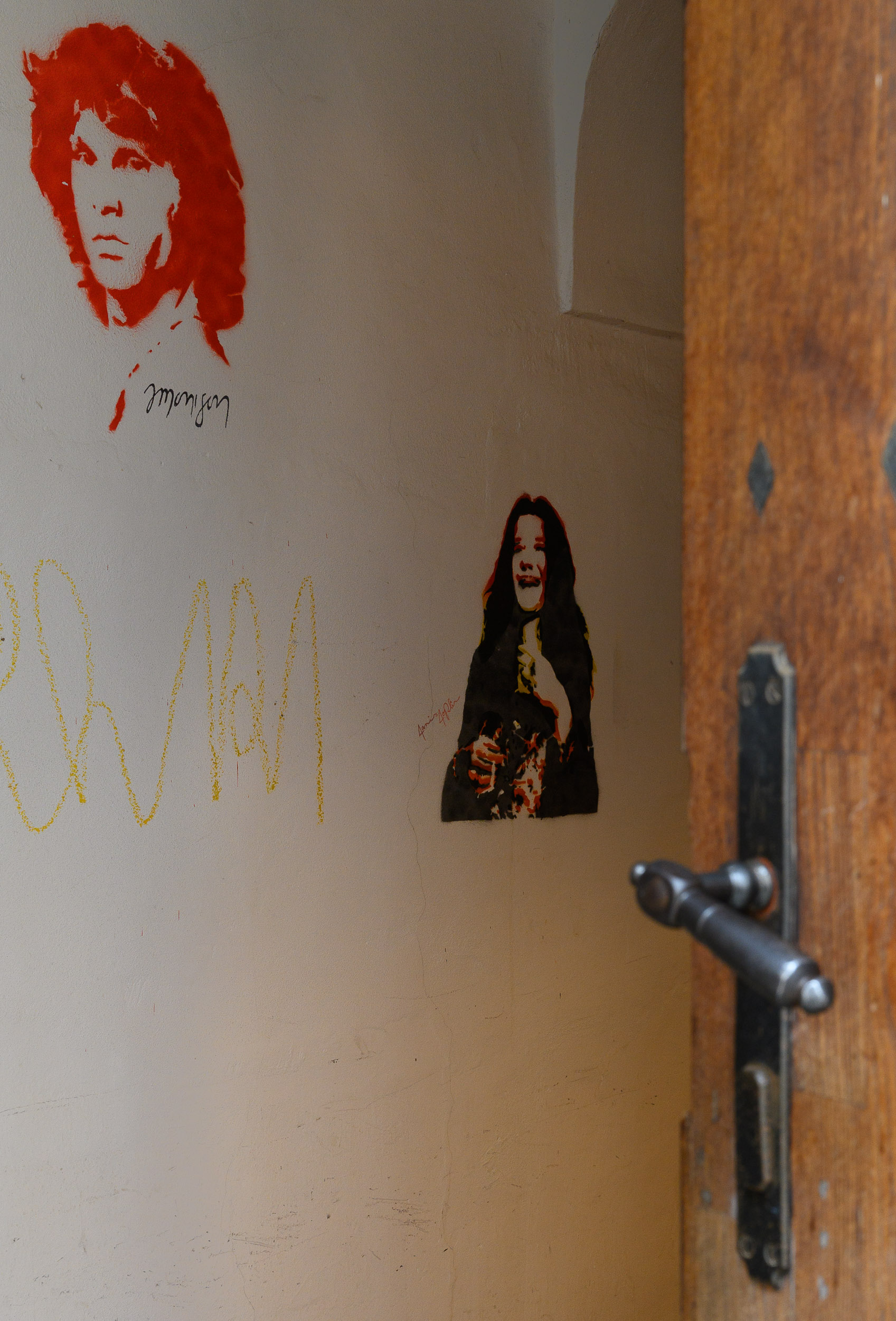 Arte callejero, más o menos, en un portal de Olomouc en el que se recuerda a Jum Morrison y Janis Joplin.
