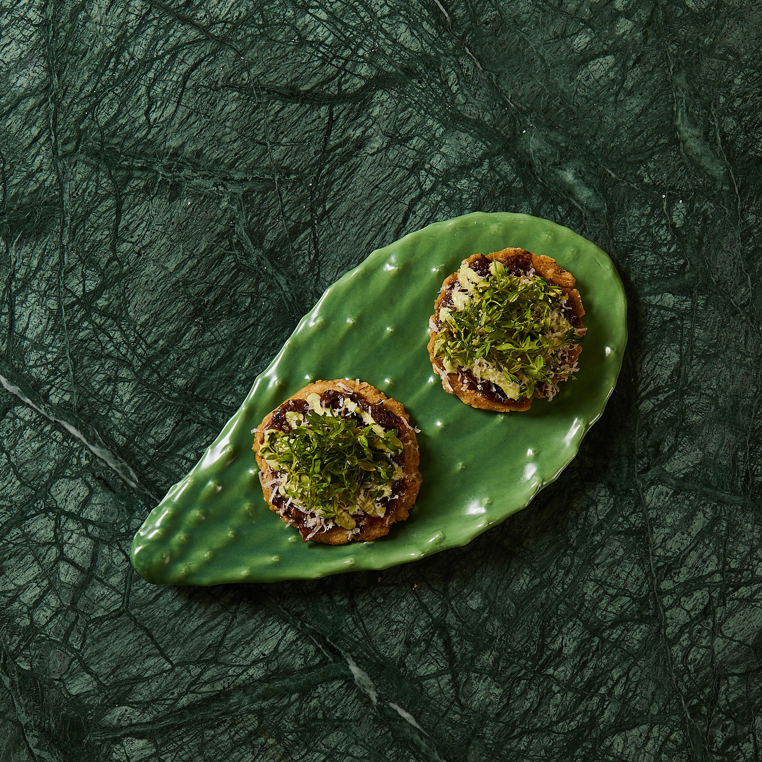 Arepitas de rabo de vaca, con una pipirrana de pomelo, chile poblano y gel maracuyá, coronada con queso Idiazábal.
