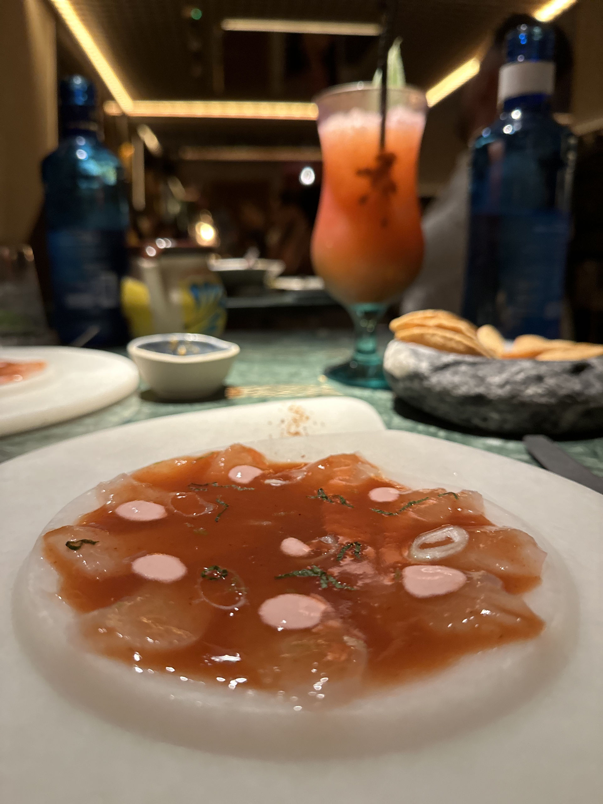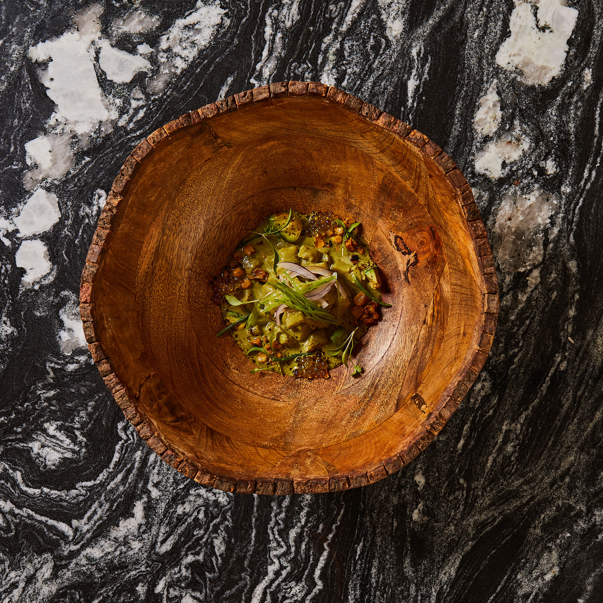El ceviche verde de pargo, dados de aguacate tatemados, tirabeques y achiote.