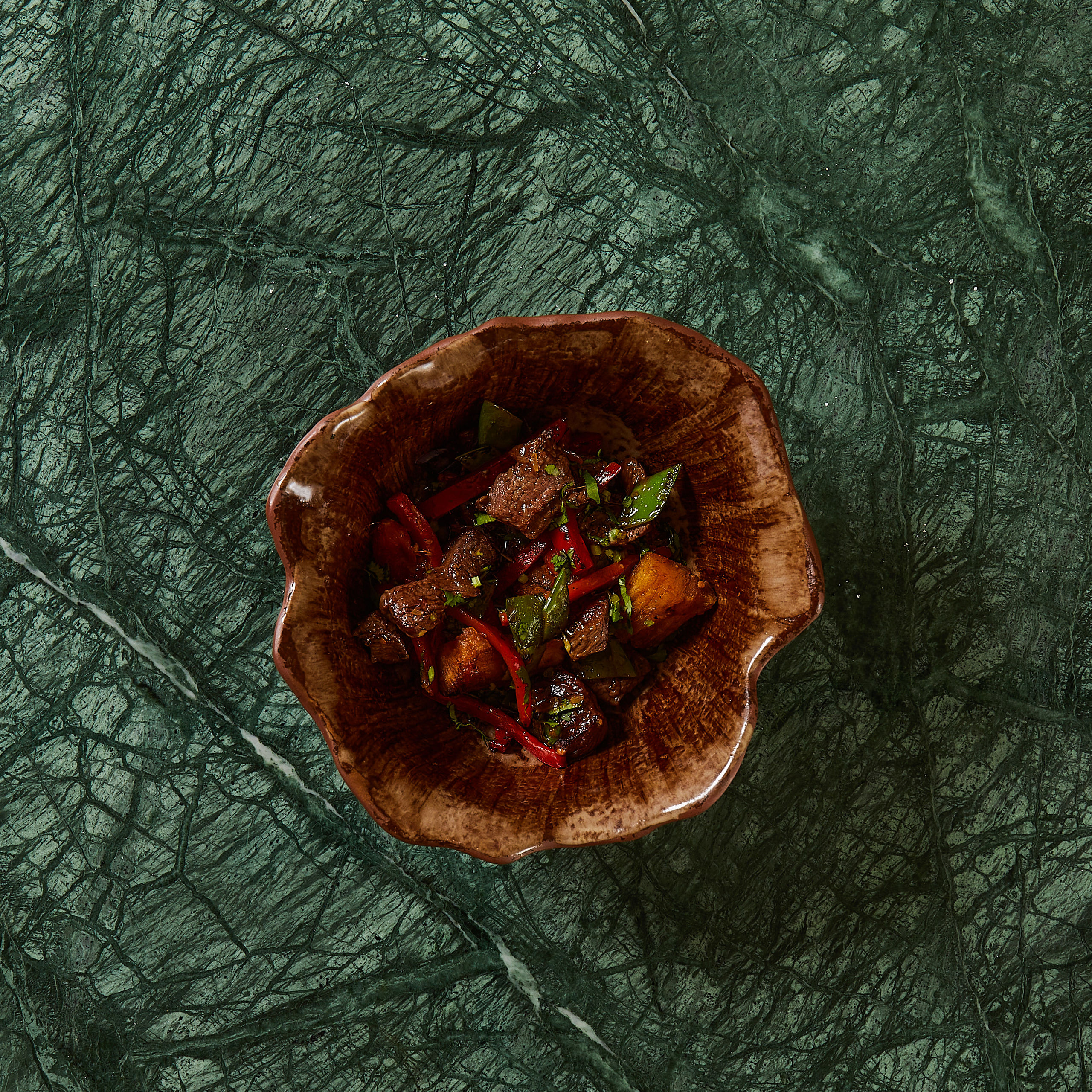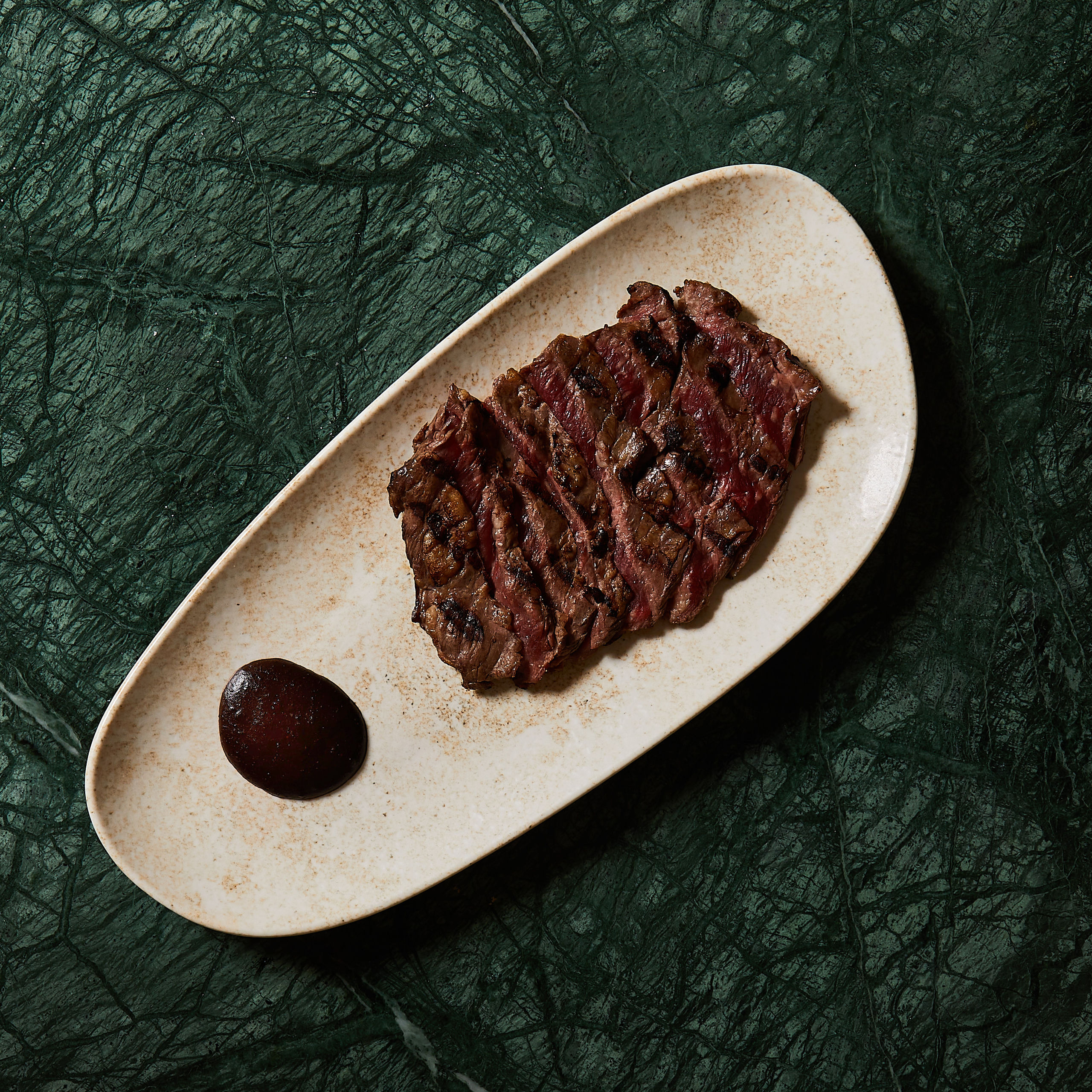 Entraña de vaca madurada, Con aguachile de ajos negros y Huitlacoche.