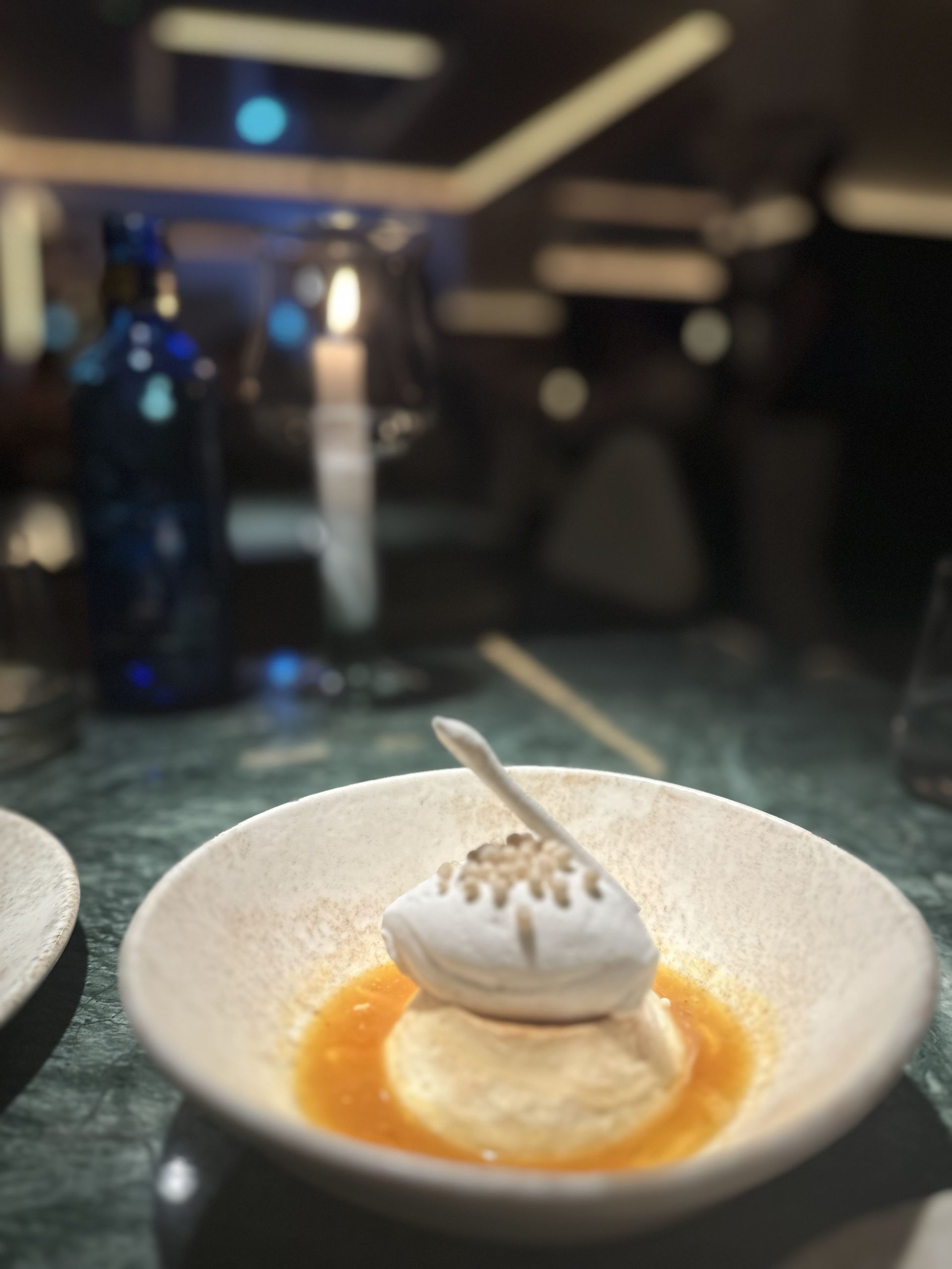 Flan de queso cremoso, con una refrescante y deliciosa sopa de maracuyá, chile chipotle y chantilly de haba tonka.