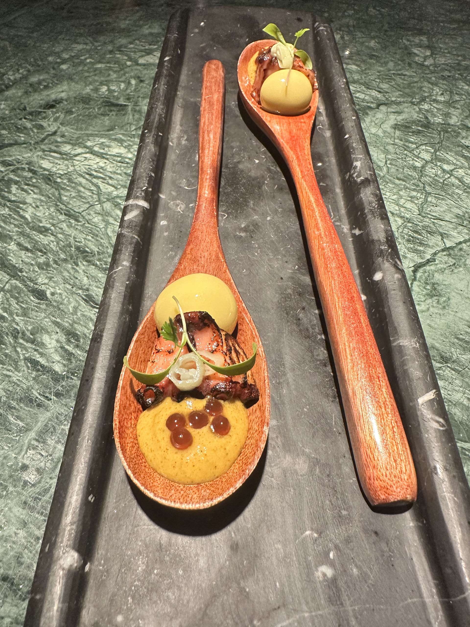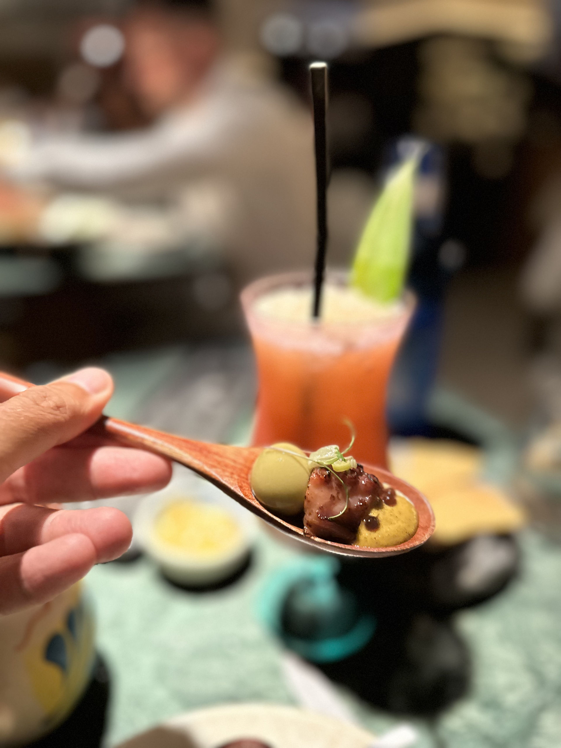 La gilda que se perdió en Machupichu, con shot de aceituna, pulpo a la brasa, un toque de botija y piparra encurtida y una salsa de ají amarillo.