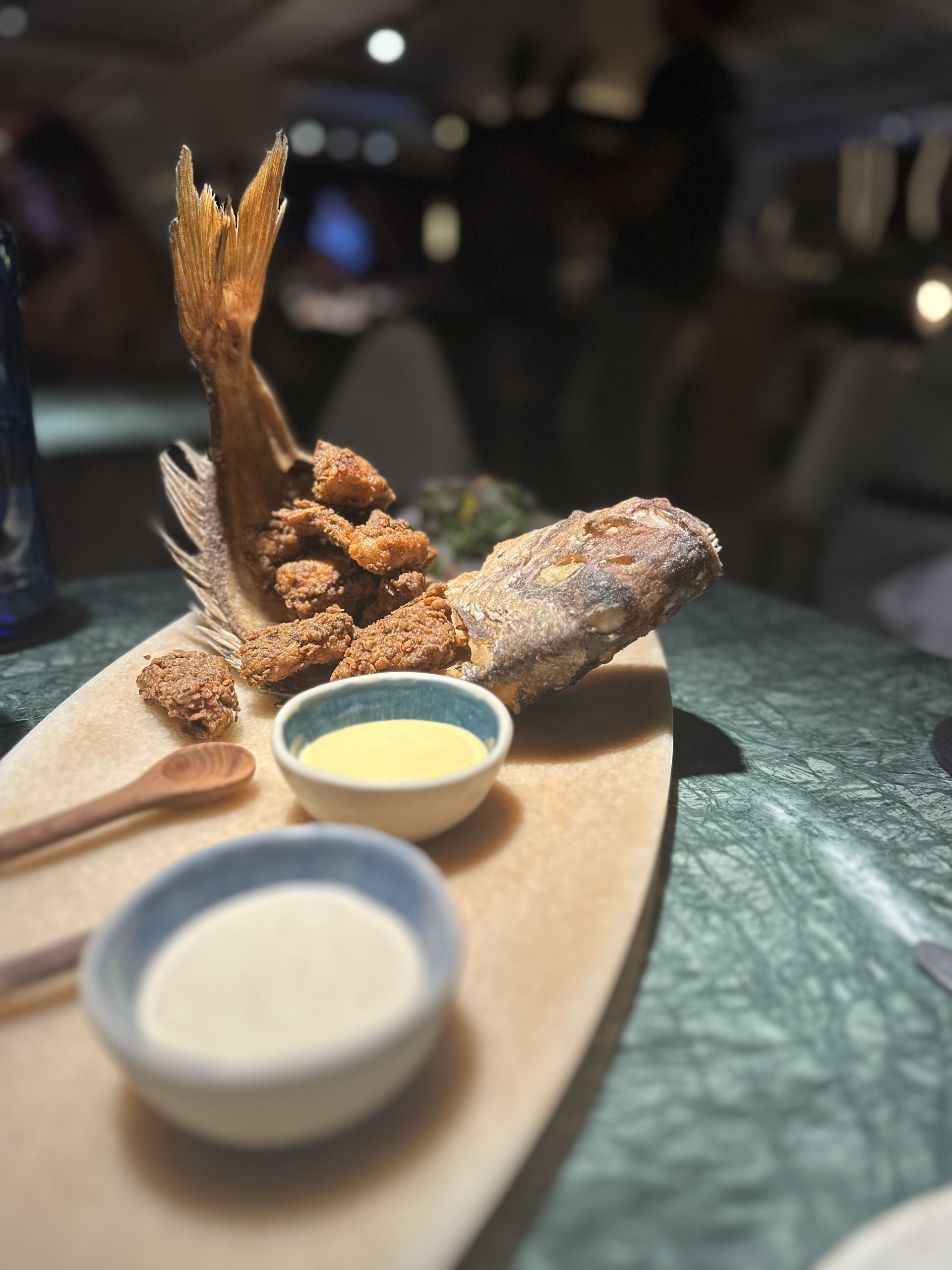 Pargo en adobo y frito entero, acompañado de una pequeña ensalada de brotes con emulsión de ají amarillo. Recomendado comer la espina y la cabeza.