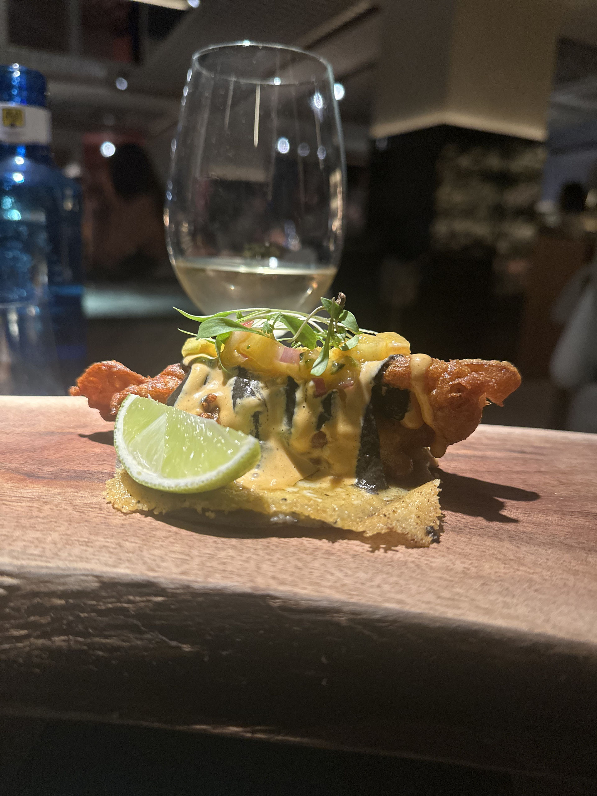 Espectacular taco al Gobernador de soft shell crab. La tortilla es de maíz morado, con una lámina de queso Paisa gratinado que viene de Colombia, pico de gallo de hoja santa y una salsa de huitlacoche y tamarindo.
