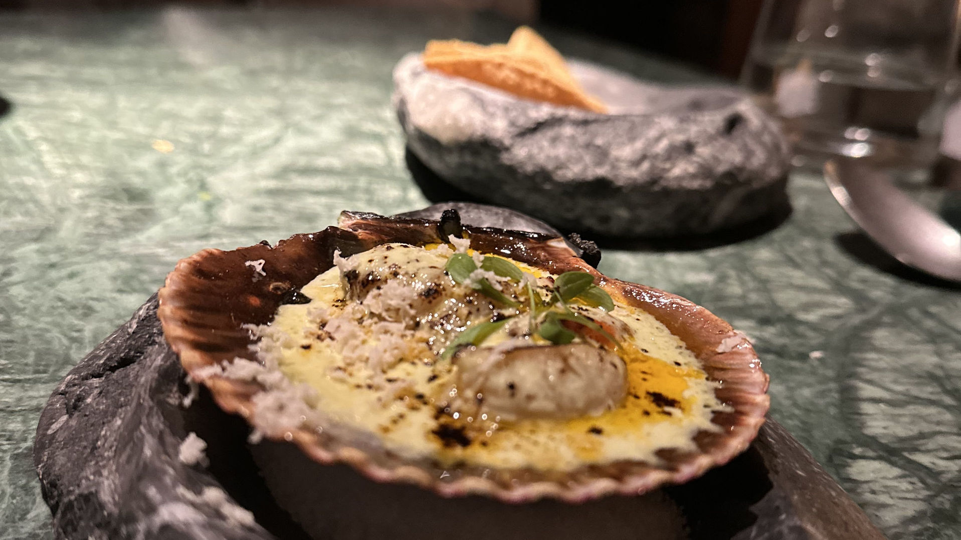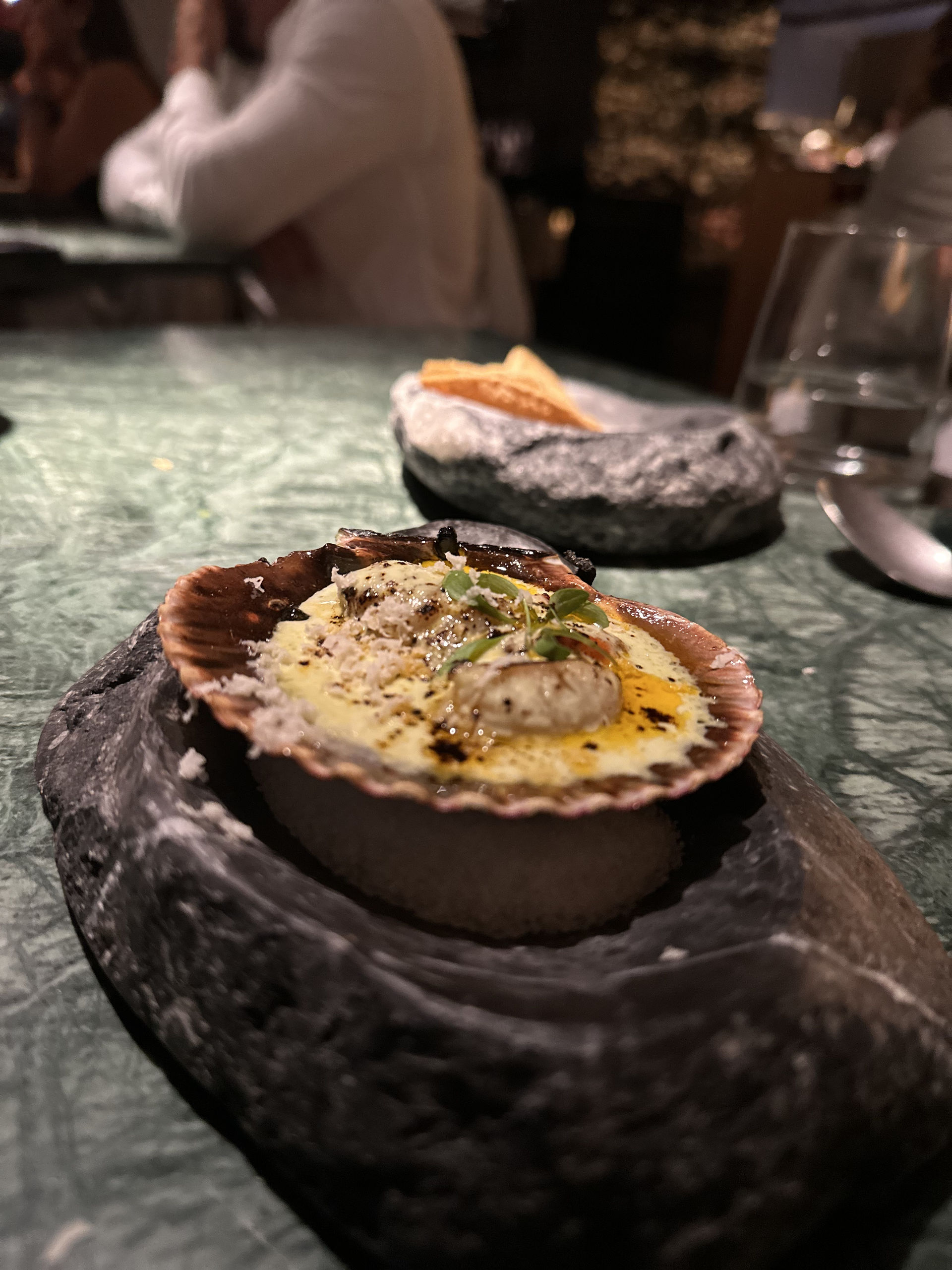 Inconmensurable vieira del Pacífico a la brasa, probablemente de las mejores que he probado. Con una salsa de tomatillo, jalapeño y coronada con polvo de chile pasilla y terminado frente al comensal con rábano horseradish, que llega de Londres y le da el toque picante final al gusto del cliente.