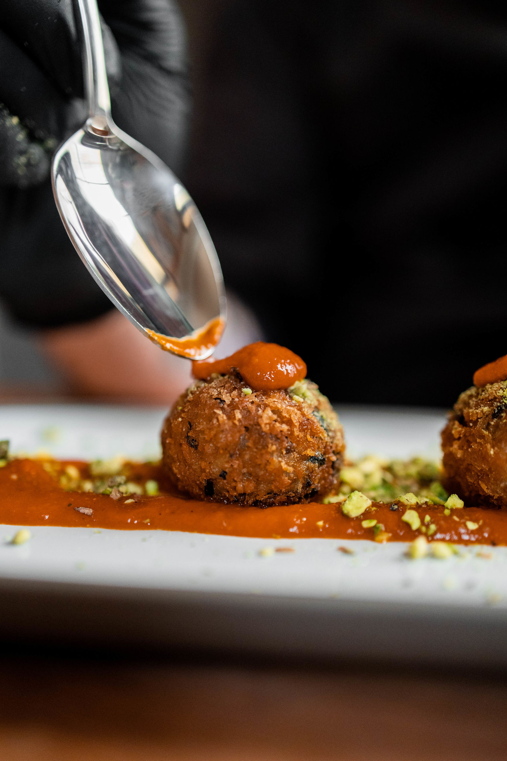 Exquisitos arancini rellenos de cochinita pibil, con mozarella, rebozado en panko y salsa all’arrabiata que pica lo justo.