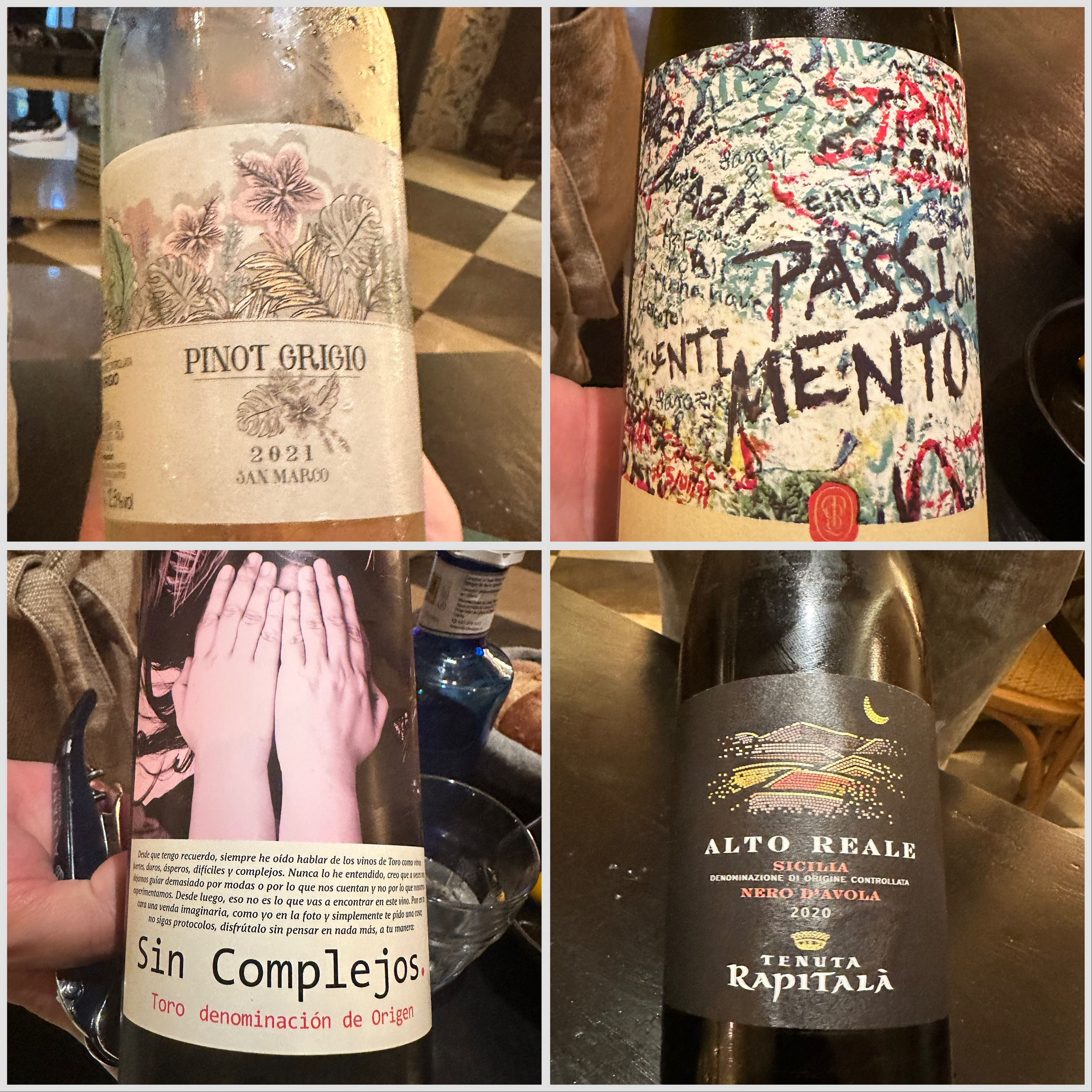 En Ostinato, como en el resto de restaurantes de Fernando, también se cuida mucho la bodega para aportar al cliente una nota diferencial que se salga de las clásicas denomincaciones de origen que pueblan la mayoría de los restaurantes. Por eso, te recomiendo que te dejes guiar y así probar los buenos líquidos que tienen, algunos de ellos procedentes de Italia, pero también de nuestro país. Nosotros comenzamos con un vino blanco San Marco Pinot Grigio de la zona italiana del Friui, seguido de otro buen Passione e Sentimento elaborado por la Famiglia Pasqua y que evoca la historia de amor que ha hecho famosa a Verona en todo el mundo, la de los amantes Romeo y Julieta. Pasamos a un buen Sin Complejos de la variedad tinta de Toro, de DO Toro y elaborado por la bodega Gil Lunas. Acabamos con un muy buen tinto siciliano Alto Reale Nero D’Avola con denominación de origen IGT Terre Siciliane y elaborado por la bodega Tenuta Rapitala.