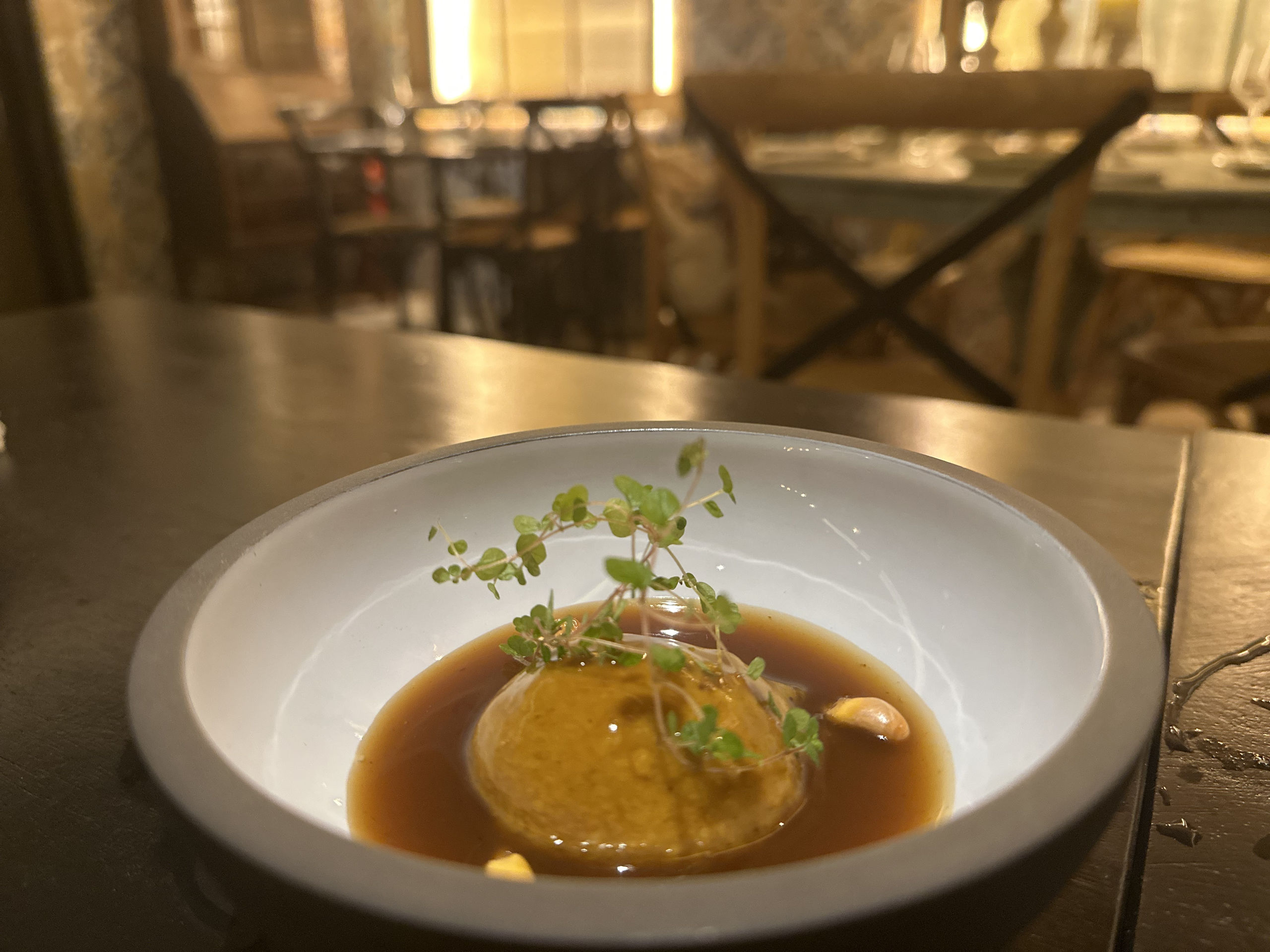 Espectacular mochi de osobuco con salsa agripicante de sus propios jugos. Como nos cuenta Fernando, es un mochi salado, con una masa que la hacen ellos y a la que le añaden un poco de curry de Madrás. El mochi va relleno de osobuco, salsa de los jugos de la cocción del mismo y con un poco de tamarindo y ponzu.