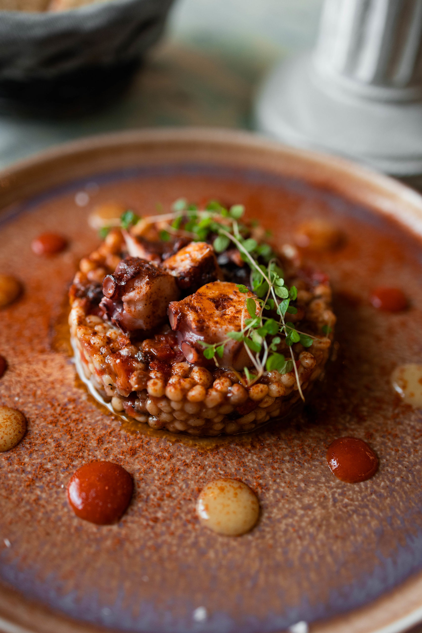 Buen sardo de pulpo a la brasa, con frégola de Cerdeña, nueces, piñones, tomate confitado, salsa de naranja, miel y sriracha que le da un ligero toque picante.