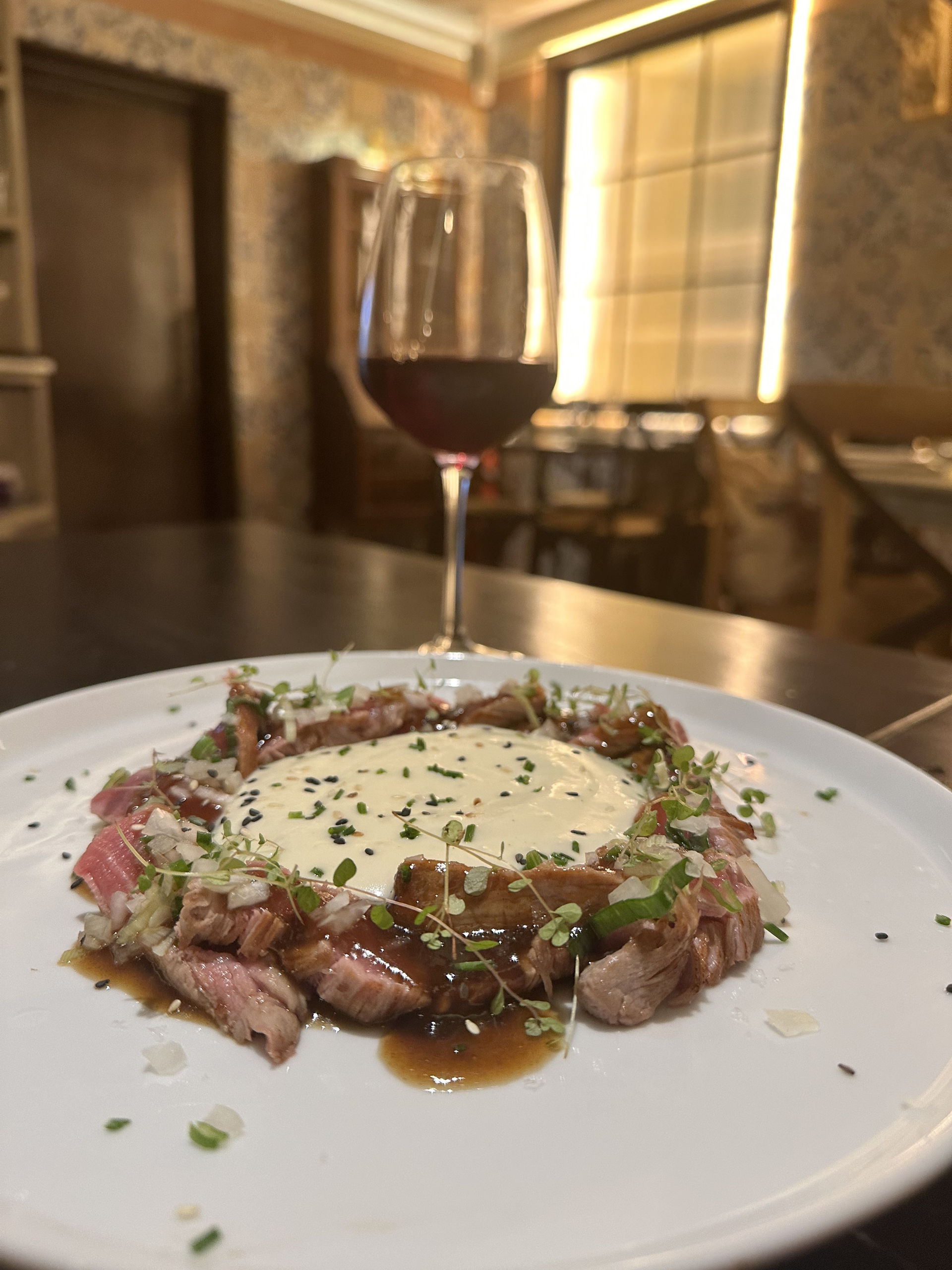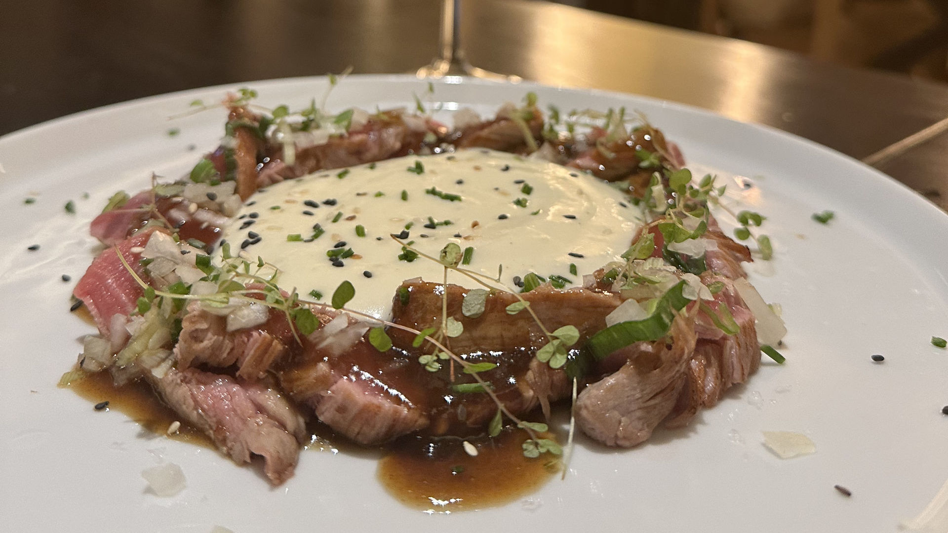 Muy rica la tagliata de solomillo con crema de parmesano. Es un solomillo cortado al modo tagliata, es decir, cortado al bies, que está hecho como si fuese un tataki y al que se le añade una crema de parmesano en el centro con una salsa Mongolian que es china y se hace con cebolleta china, ajo, soja y jengibre.