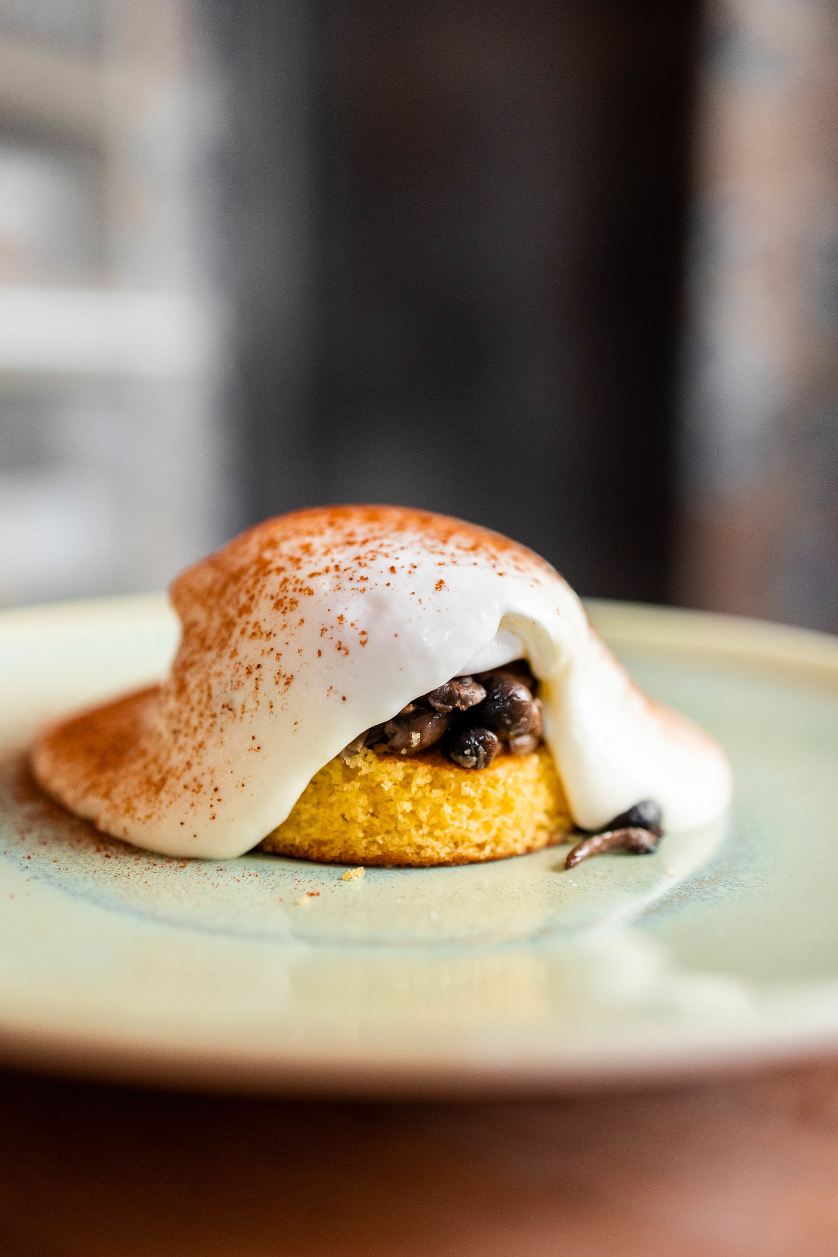 Maravilloso tiramisú de boletus, shimeji, sobao pasiego y huevo poché. La base del sobao a la plancha es una delicia cuando la juntas con el guiso de boletus y setas shimeji. Además, el toque del huevo poché cubierto con la espuma de parmesano y el tomate seco en polvo hacen de este plato una absoluta locura y uno de los imprescindibles de la carta.