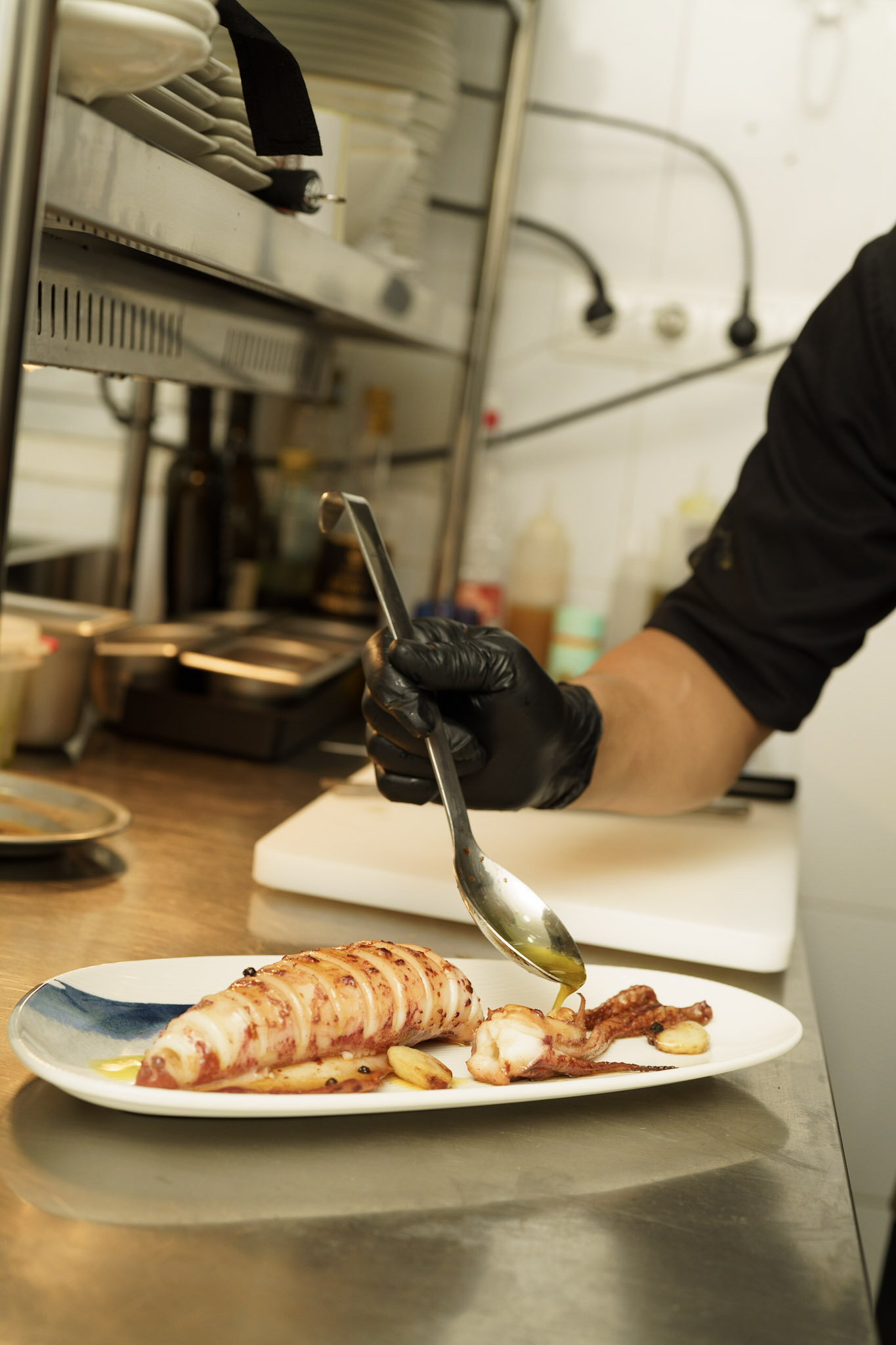 El chef emplata el calamar de potera para servirlo en la mesa.