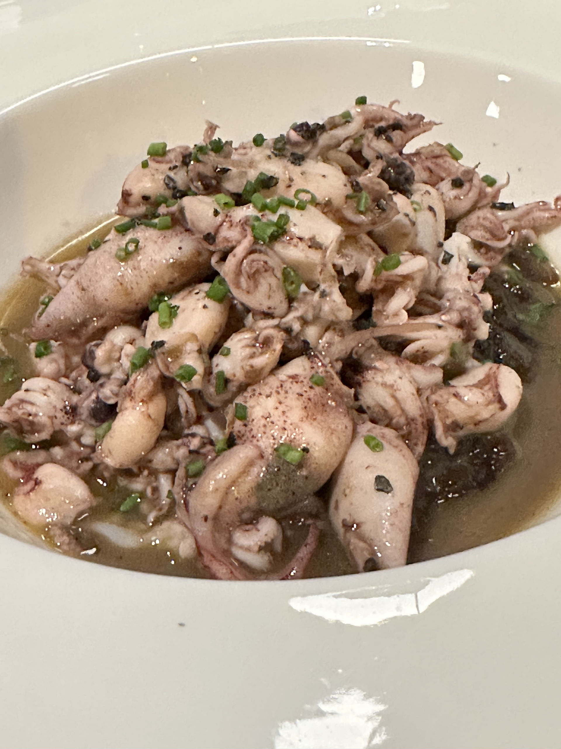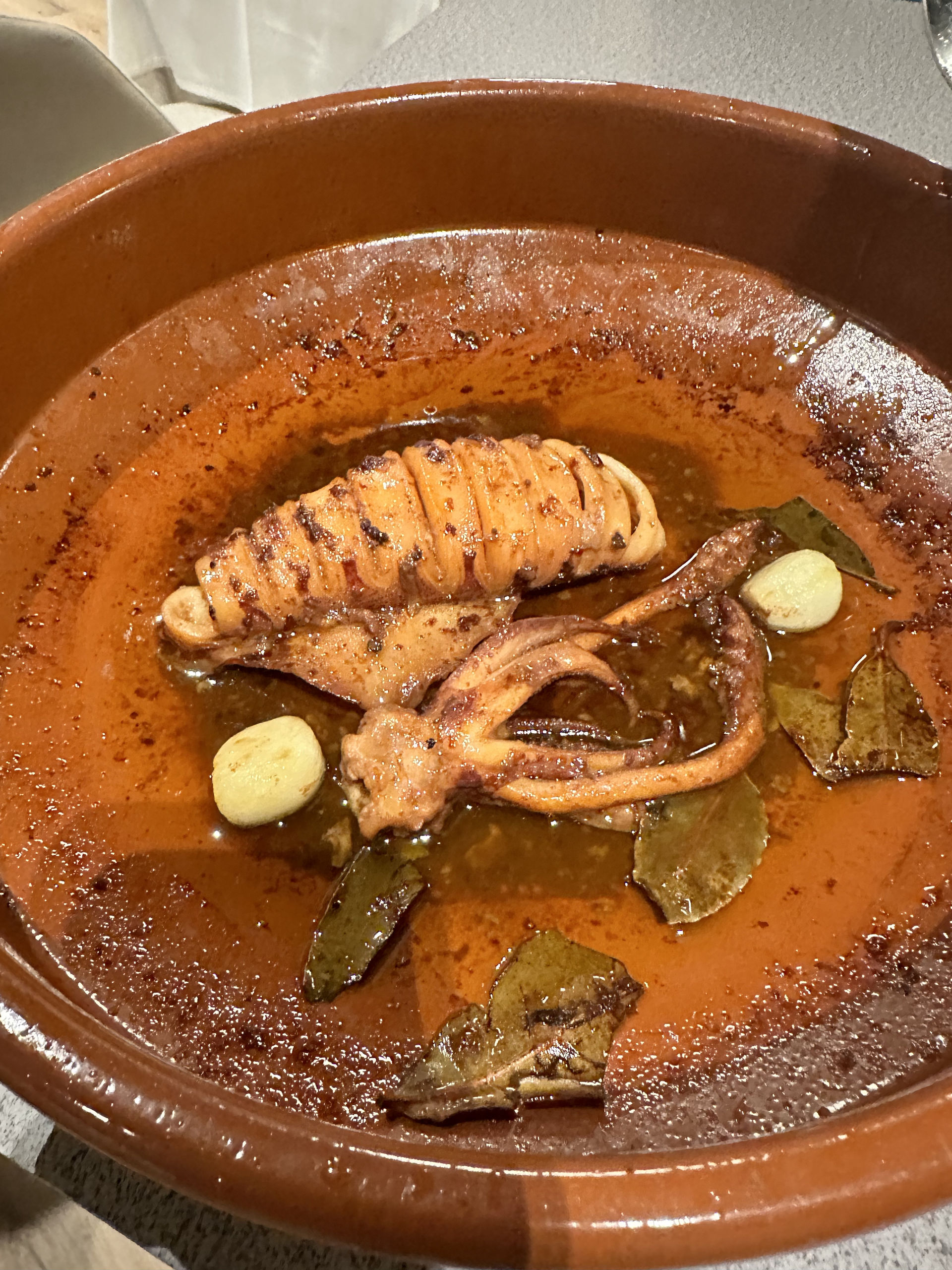 Espectacular calamar de potera a la ampurdanesa, elaborado con cava, aceite turbio sin filtrar, laurel, ajo y un fumet de pescado hecho por ellos.
