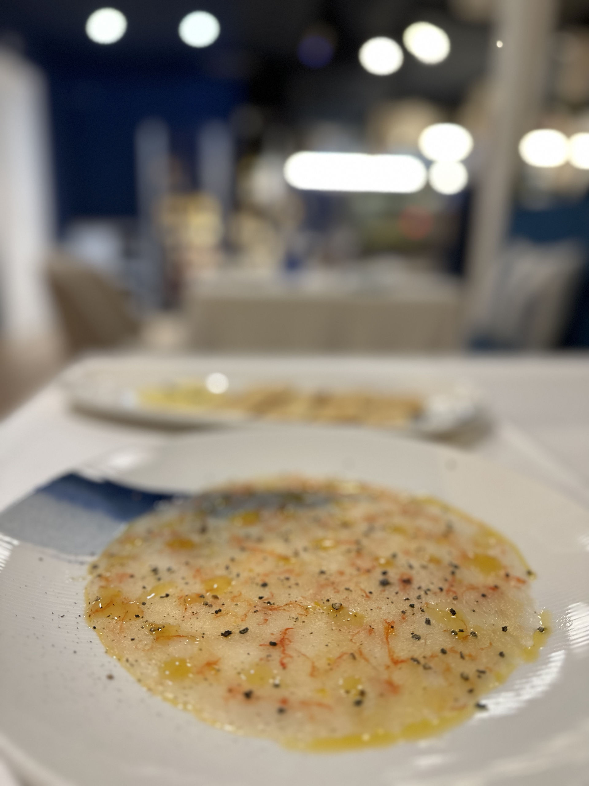 Buenísimo carpacho de gamba roja de Palamós, con un aceite hecho con sus propias cabezas y un toque de pimienta negra recién molida. Además se sirve con tostaditas y una mantequilla ahumada a la brasa totalmente adictiva.