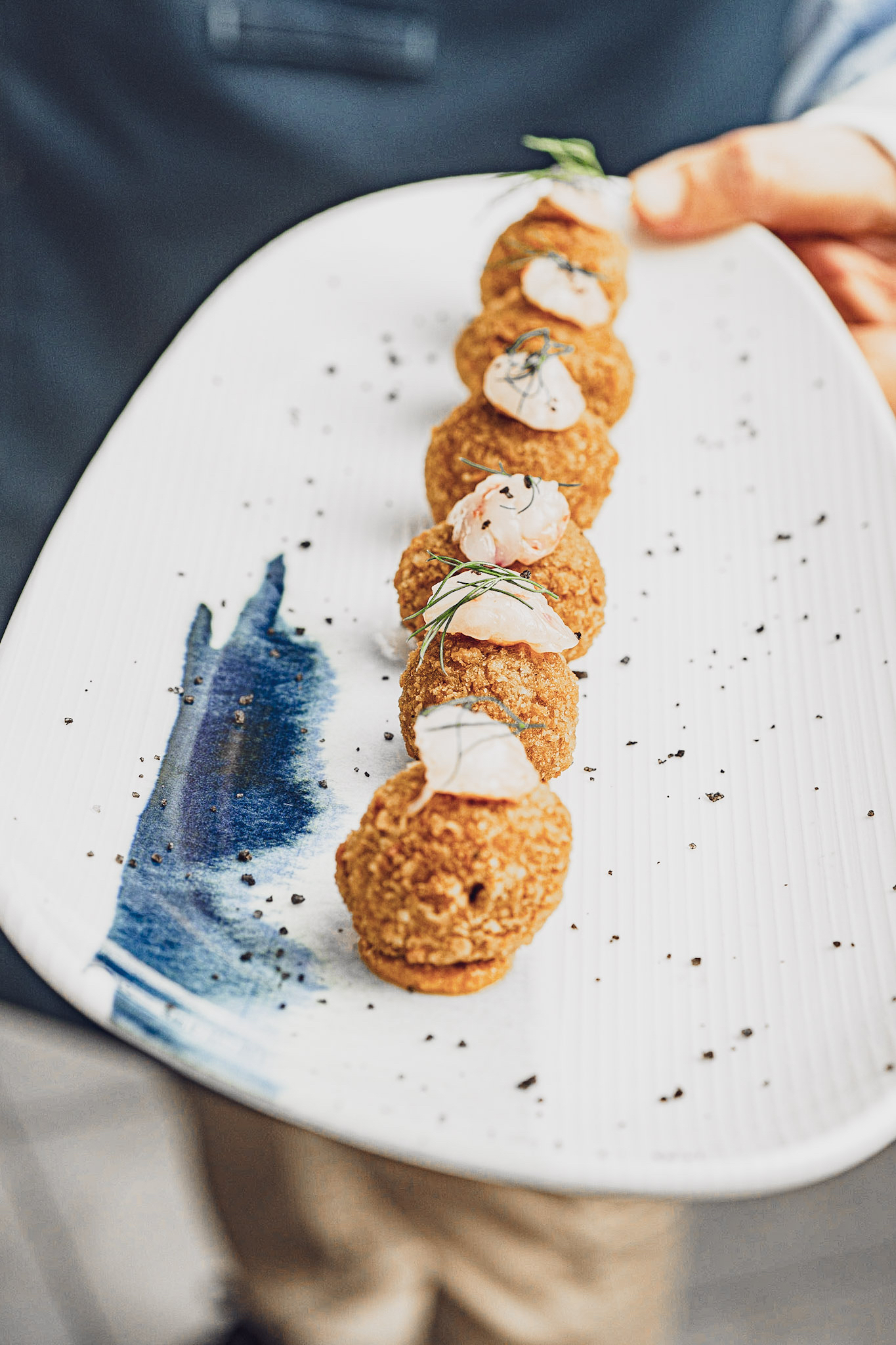 Sabrosas croquetas de gamba roja de Palamós con su romesco coronadas cada una por una gamba.