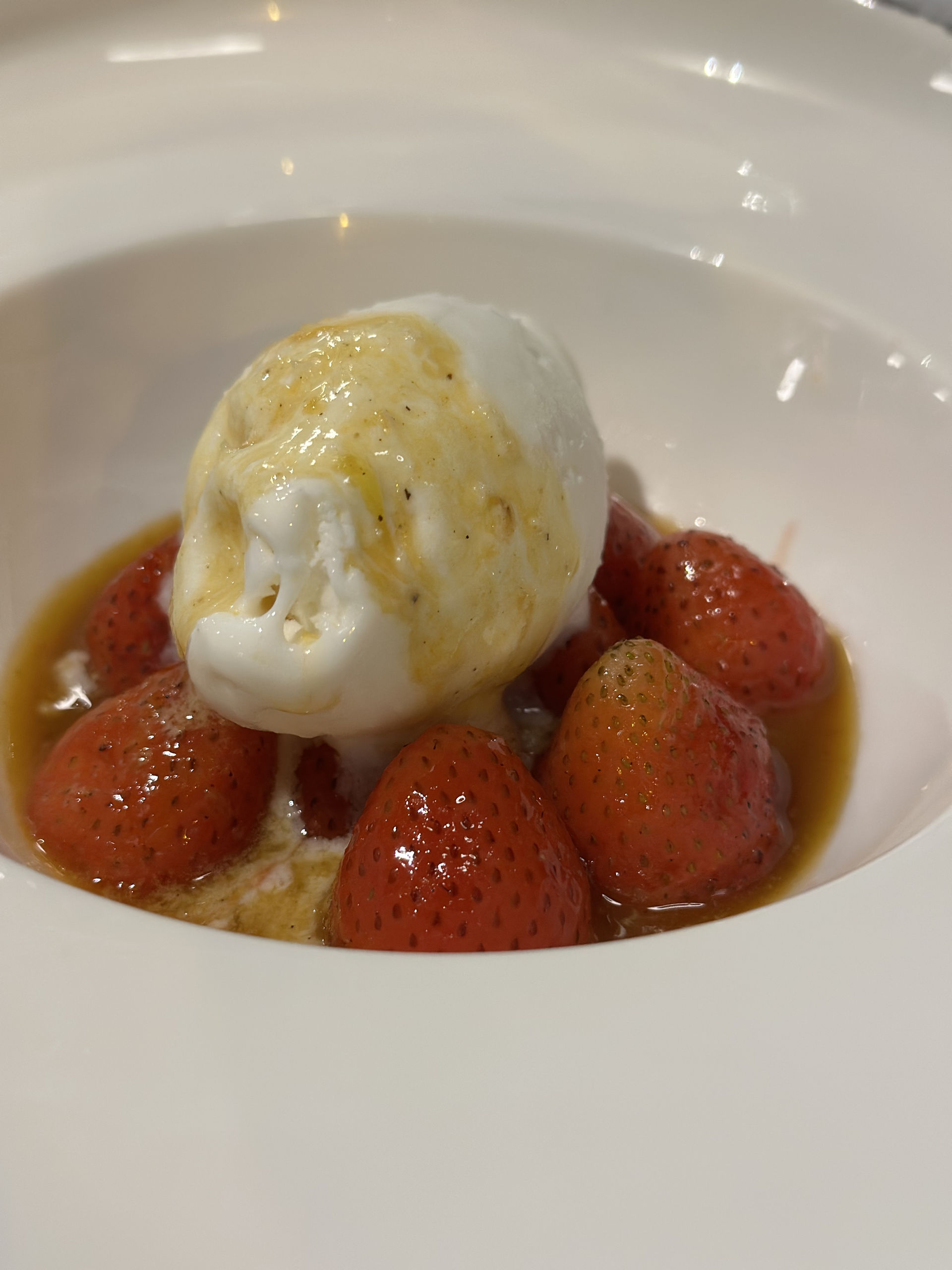Increíbles fresas a la pimienta. Preparadas en una paella con mantequilla y un poquito de azucar, se saltean y se le añade zumo de naranja. Después de unos minutos se flambea con coñac viejo, antes de terminar de flambear le tiras pimienta en polvo que se quema por lo que le da el aroma pero no se ve la pimienta. Y se acompaña por un helado artesanal de coco.