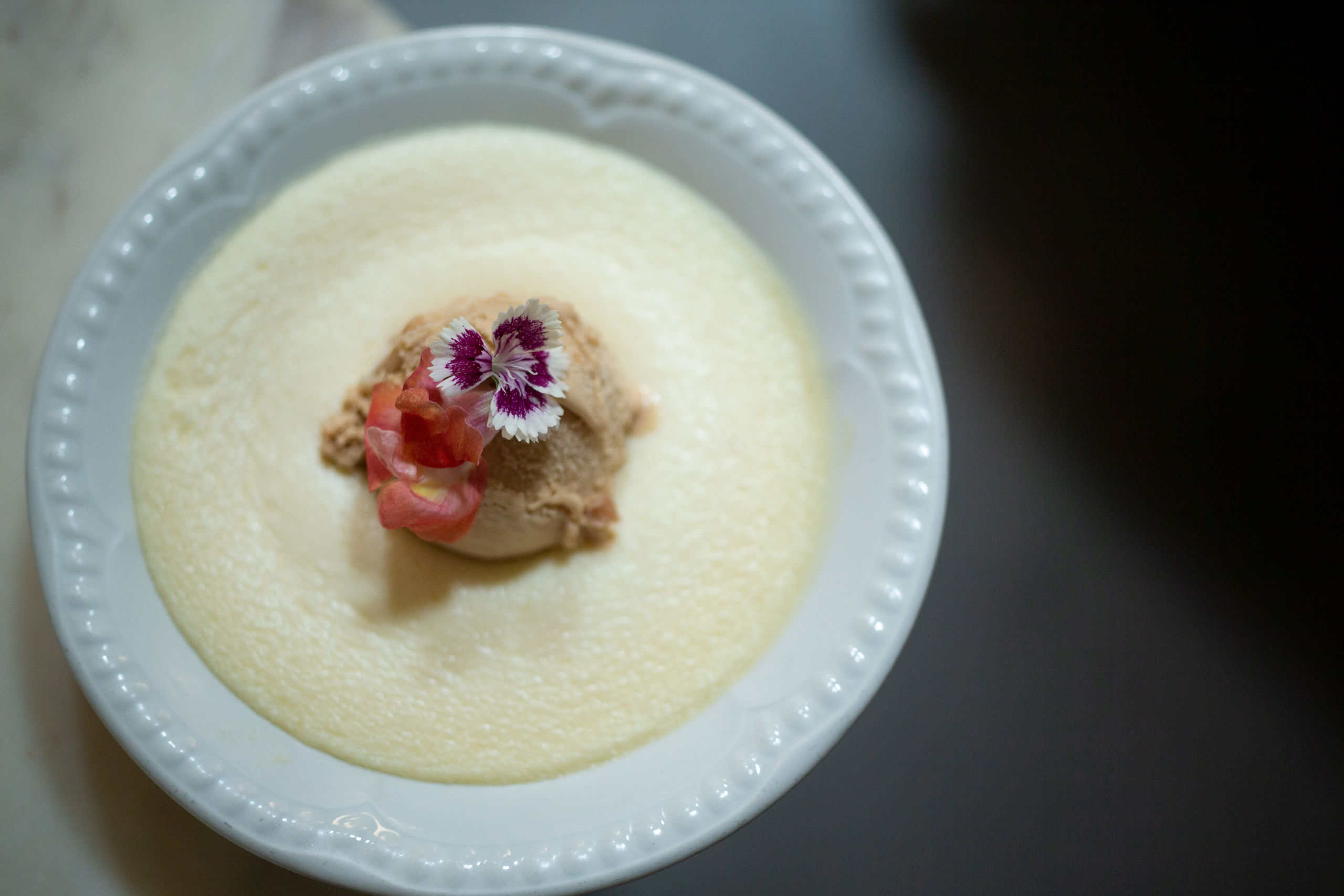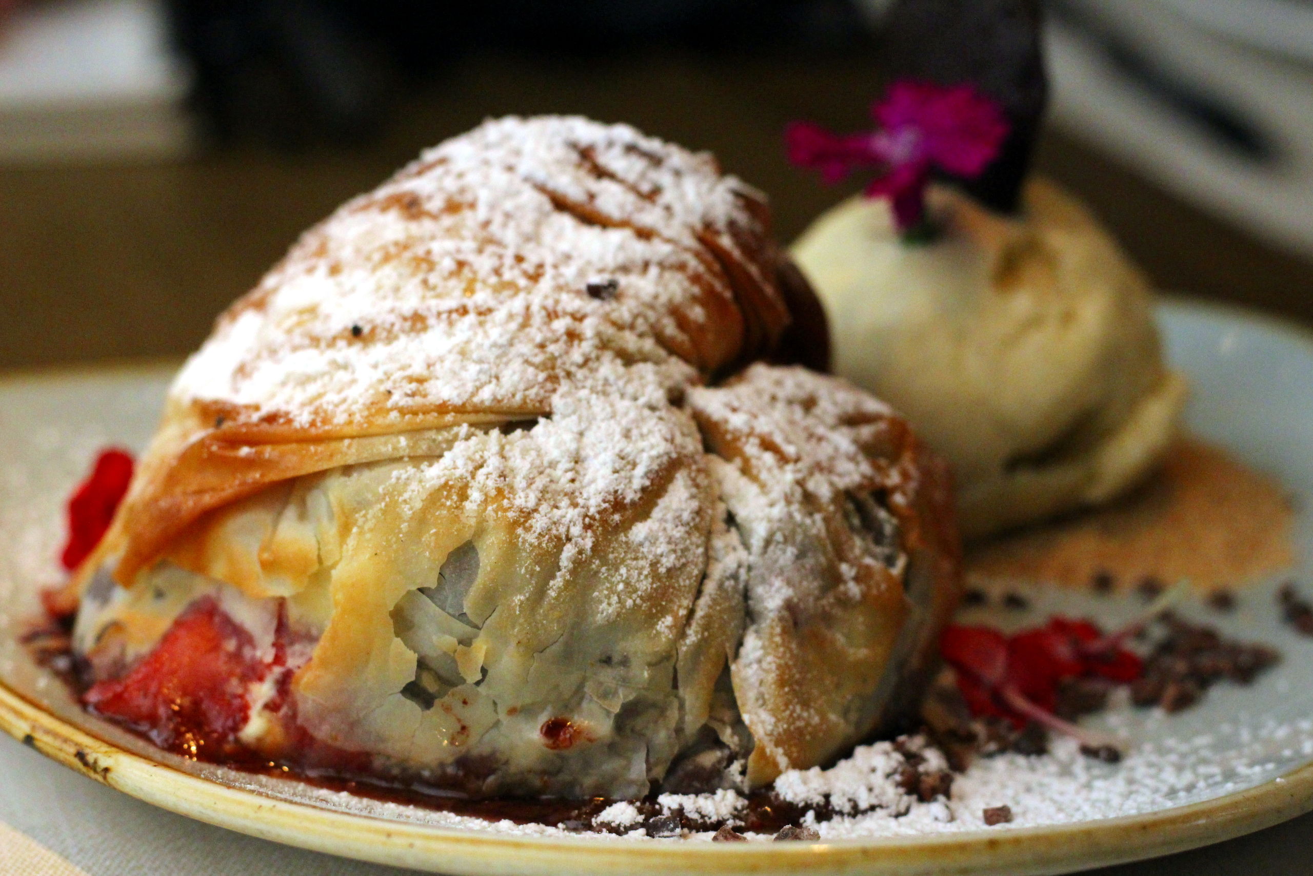 Tarta de queso de 'Los Gallos' con helado de galleta horneada en plato.