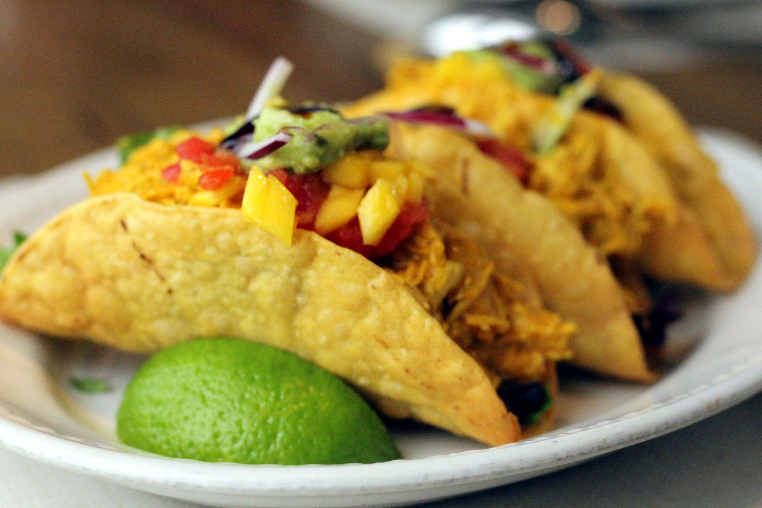 Tacos de pollo tika masala con guacamole, mango y pico de gallo.