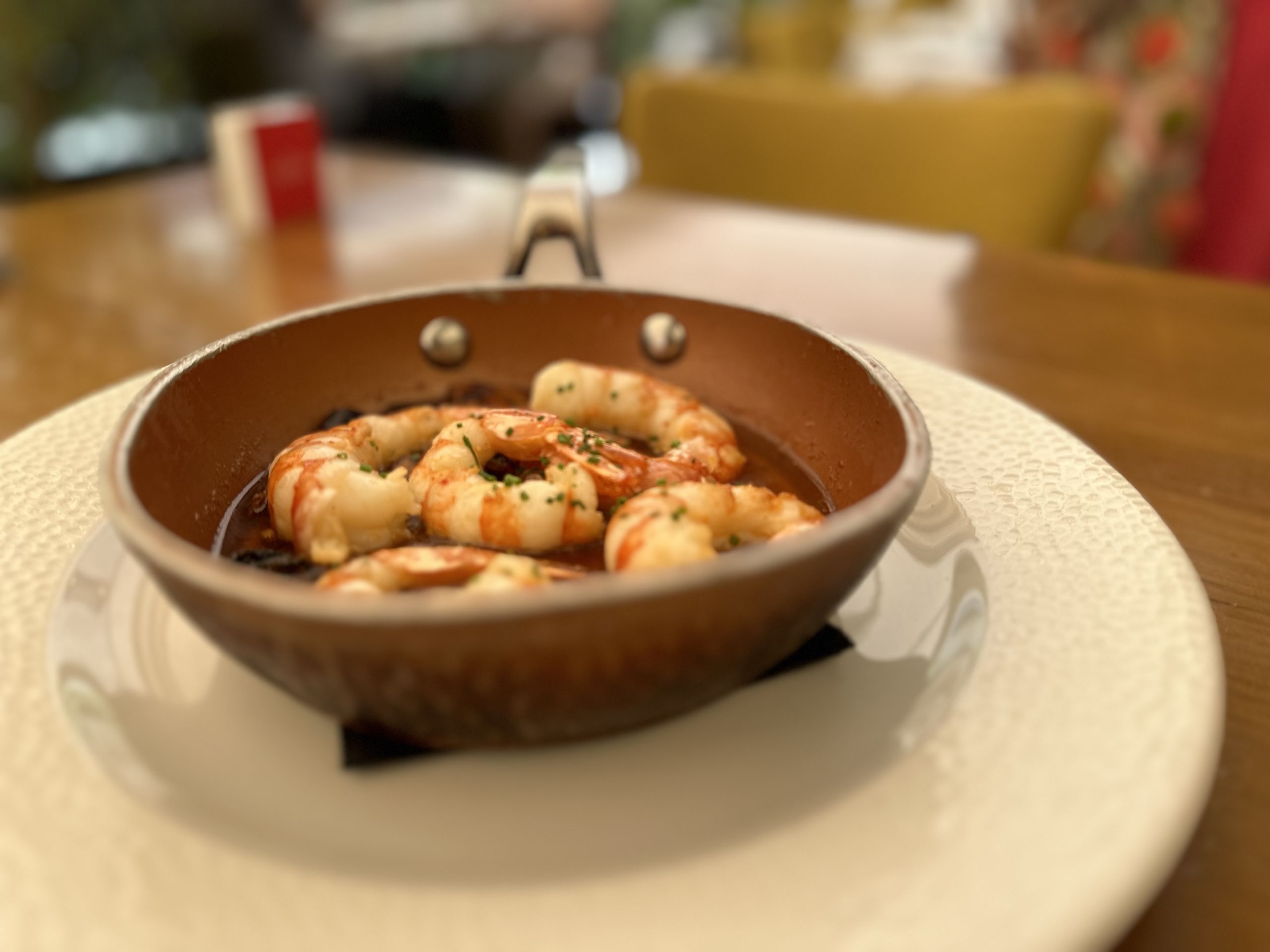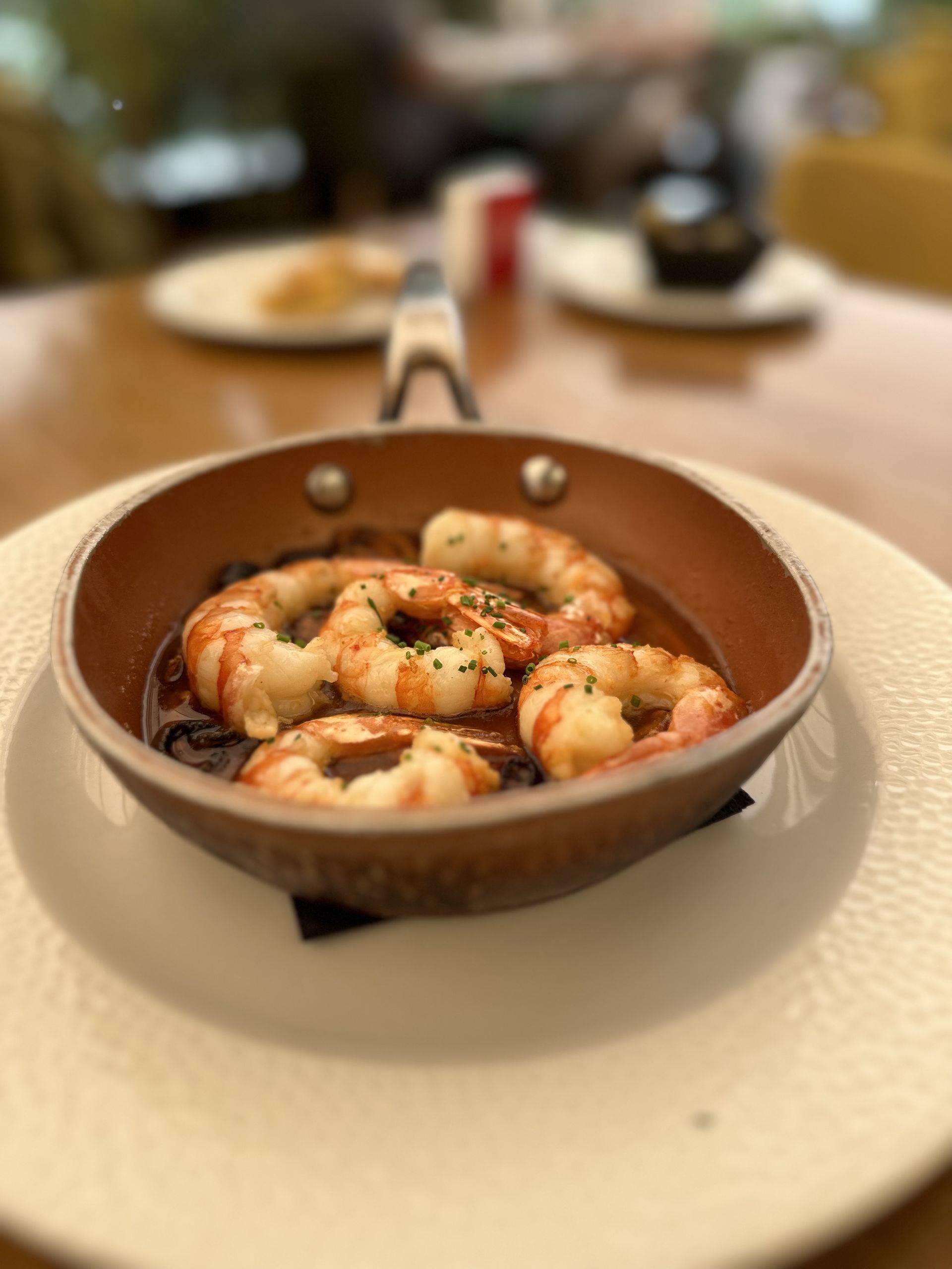Gambones al ajillo, que te llegan a la mesa en su cazuela y cuando todavía están haciendo chup chup en un aceite que luego te vas a untar.