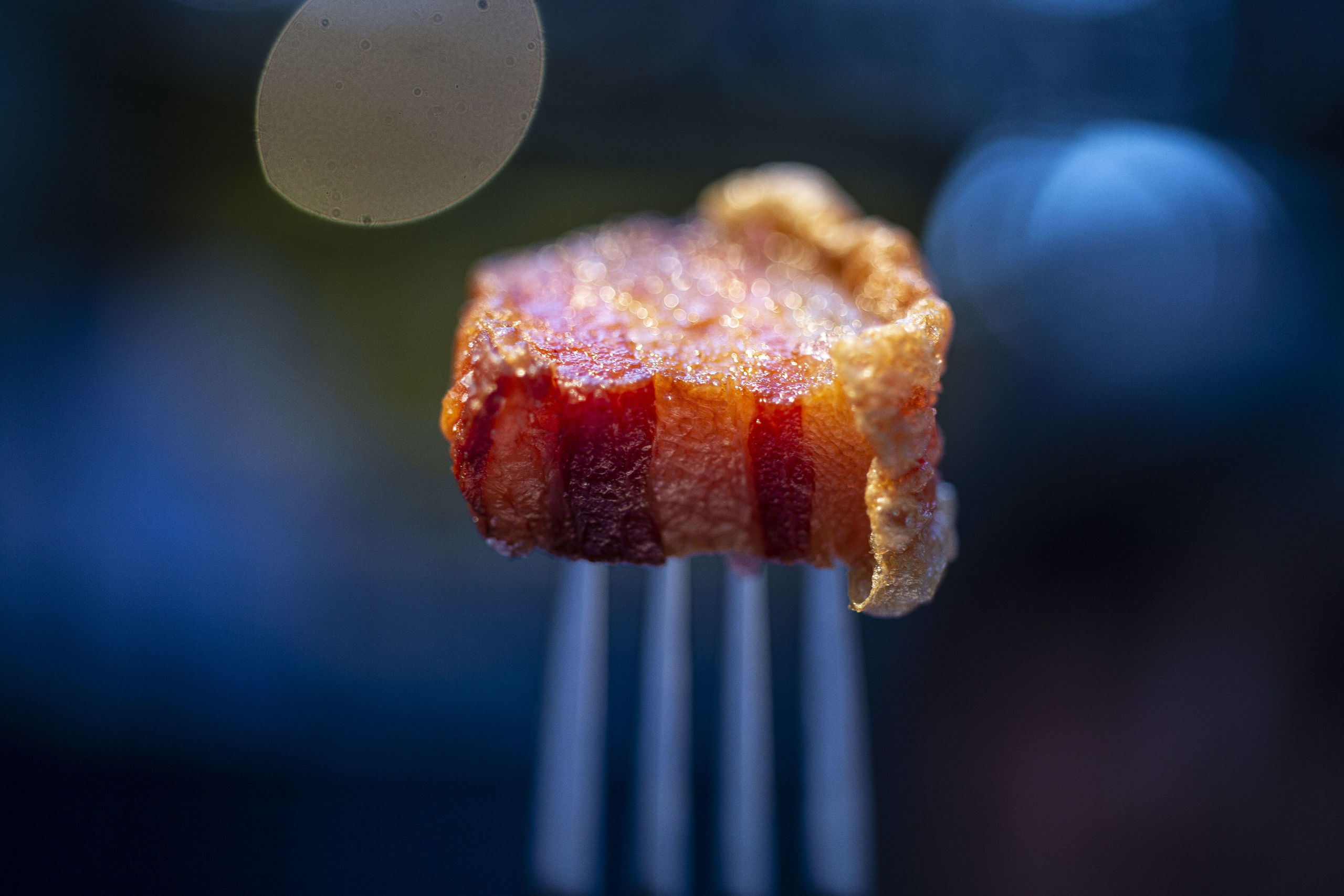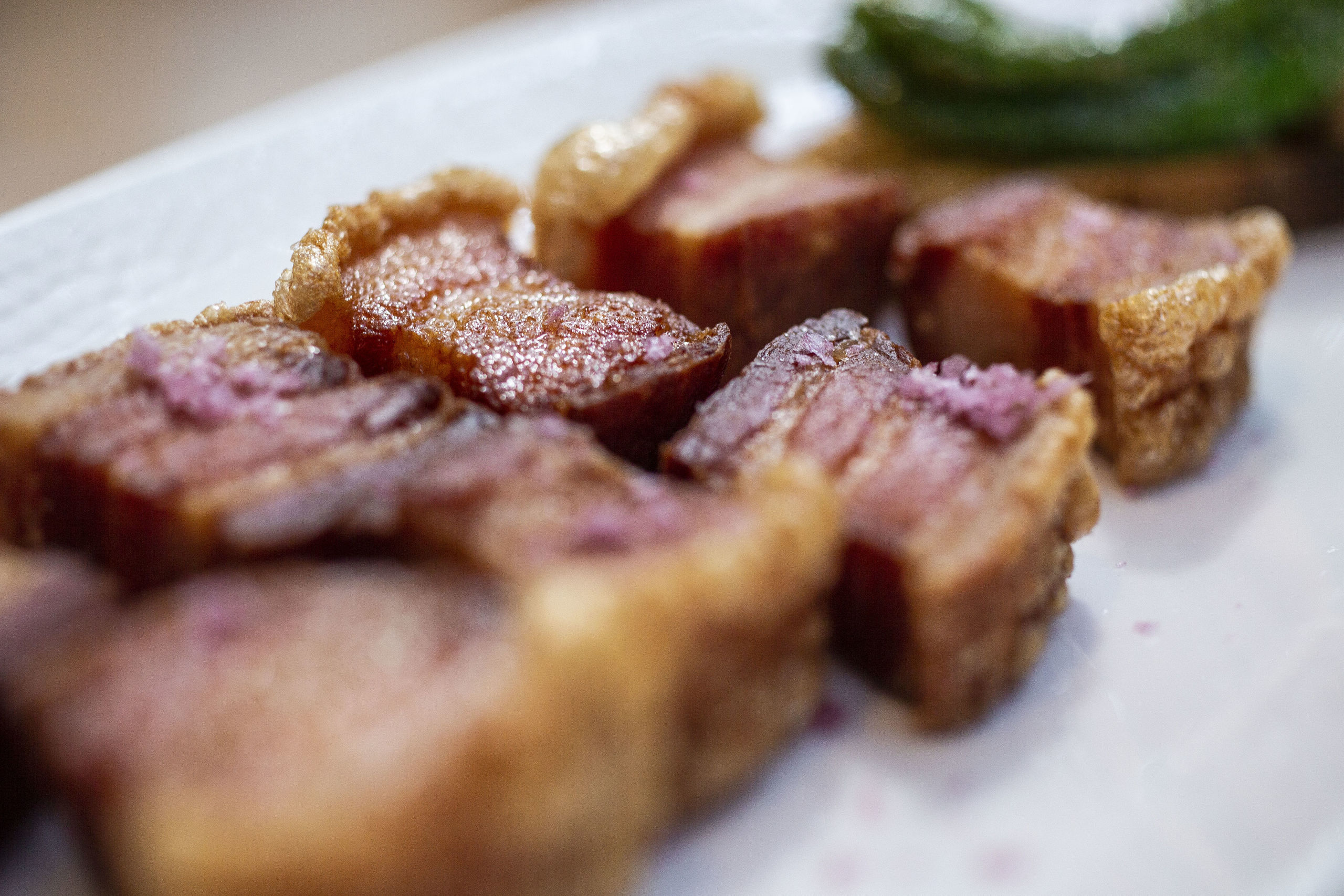 Detalle de un torrezno en el que se aprecia la corteza y la jugosidad de su interior.