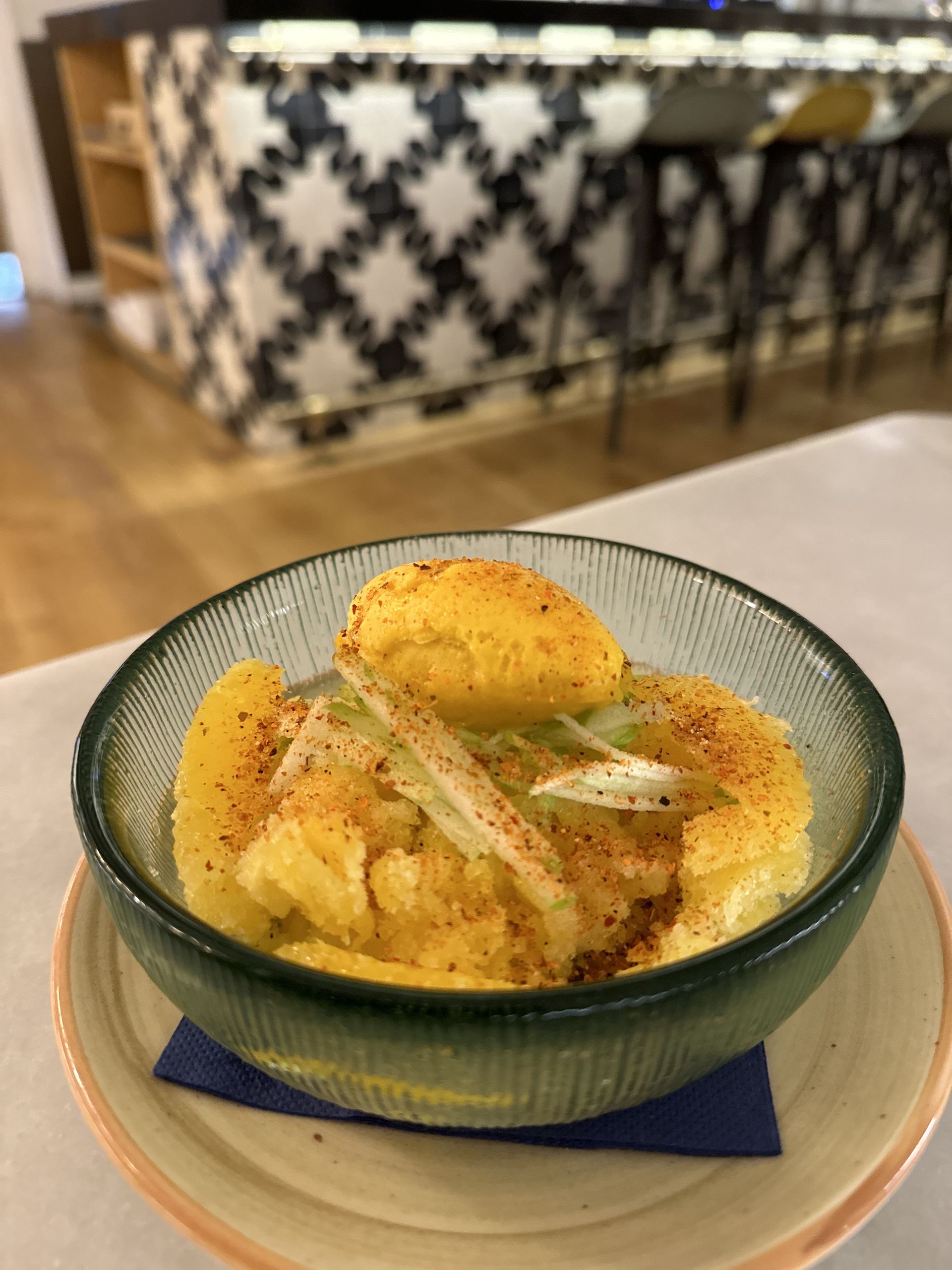 Chamoy, un postre que te sirve para refrescar el paladar después del picantito de sus platillos y tiene una salsa agridulce de chamoy, un chile mexicano infusionado con flor de Jamaica y lima, granizado de maracuyá, sorbete de mango, naranja y tajín, que en nuestro cas tenía demasiado protagonismo.