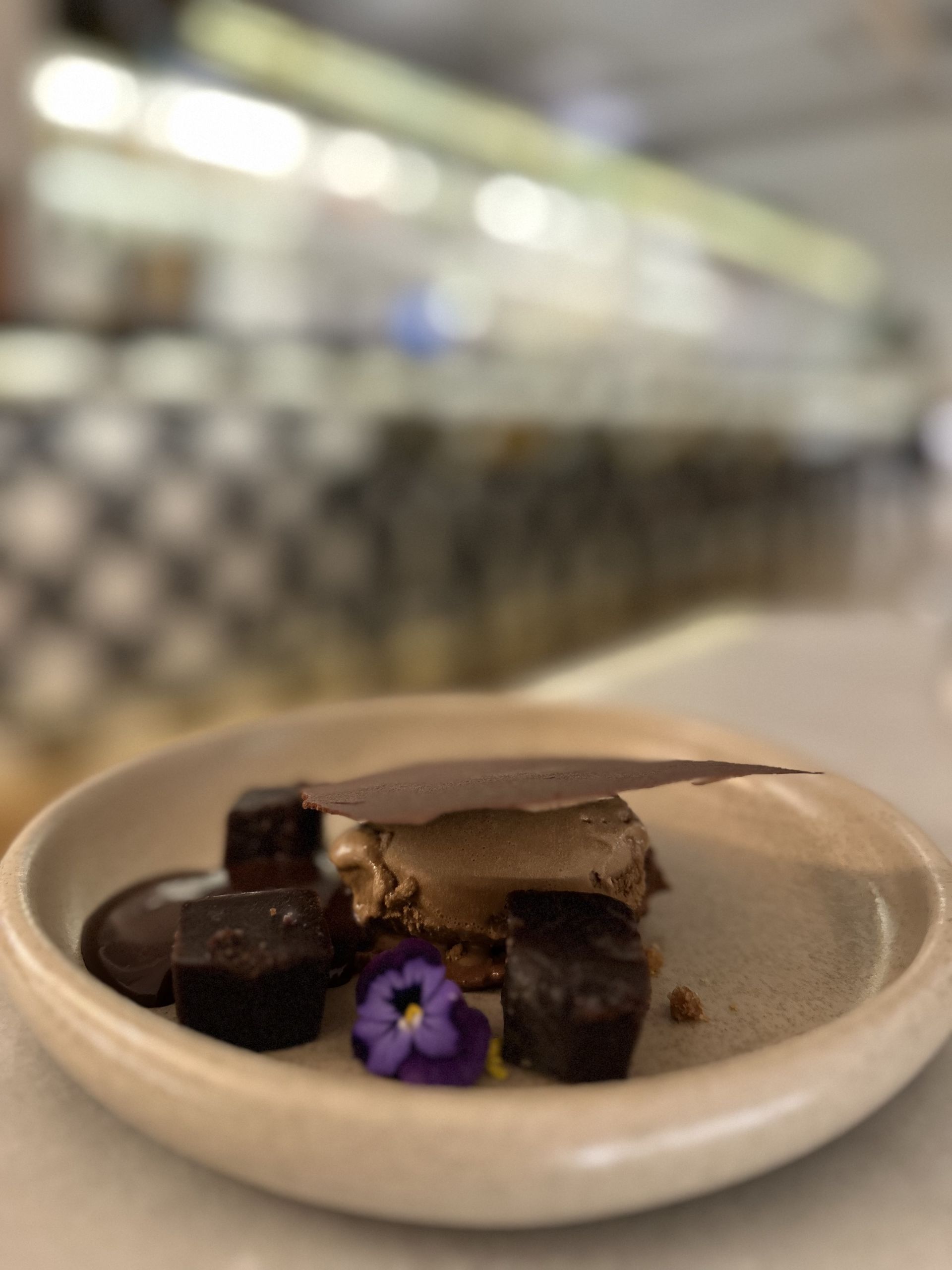 Buen postre el de chocolate en textura con helado de café, de bizcochitos húmedos de chocolate con mousse de chocolate, helado de café, un crujiente de chocolate y una salsa de chocolate negro.