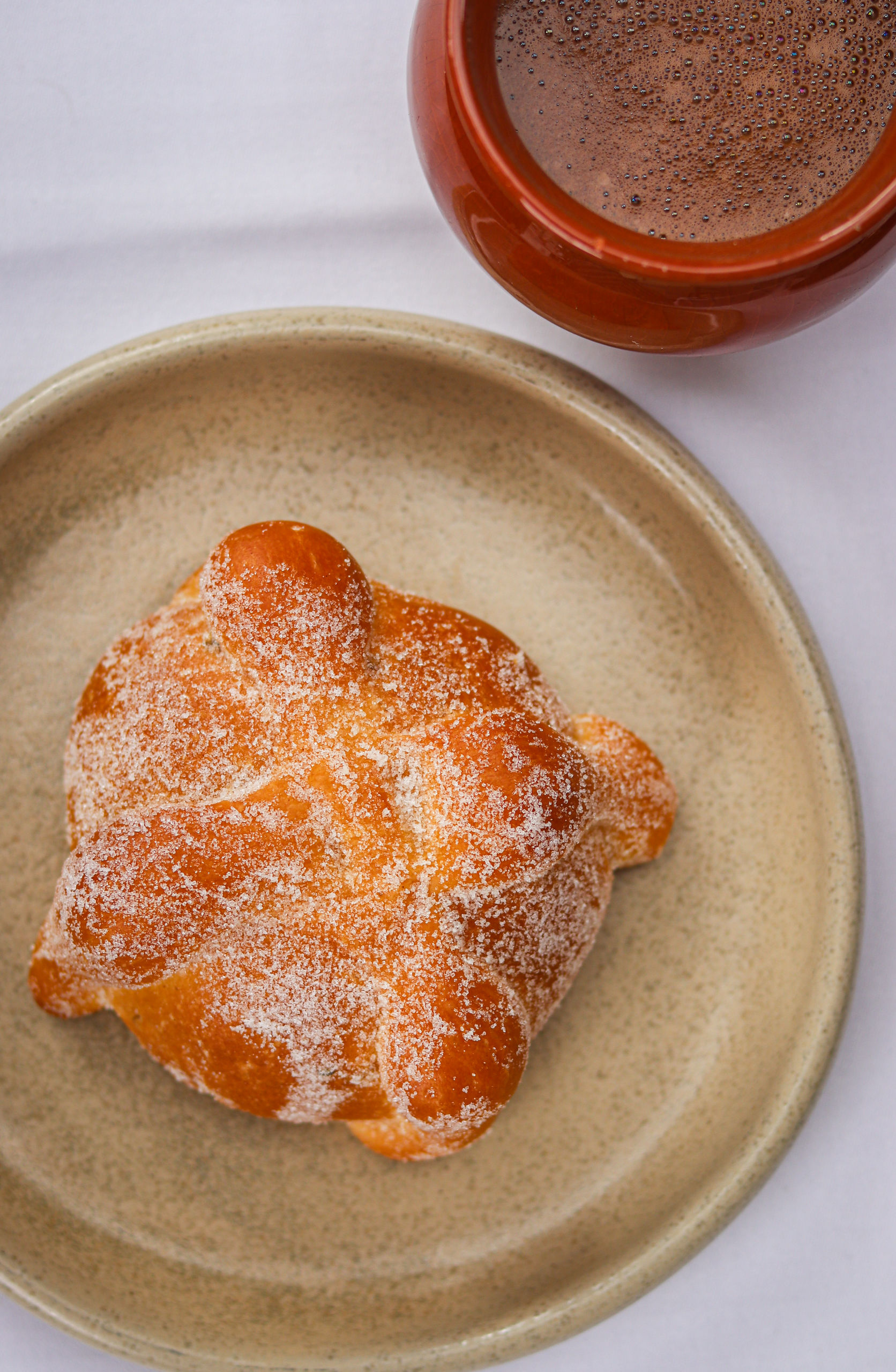 El postre tradicional de Día de Muertos: Pan de muerto tradicional y chocolate caliente especiado.