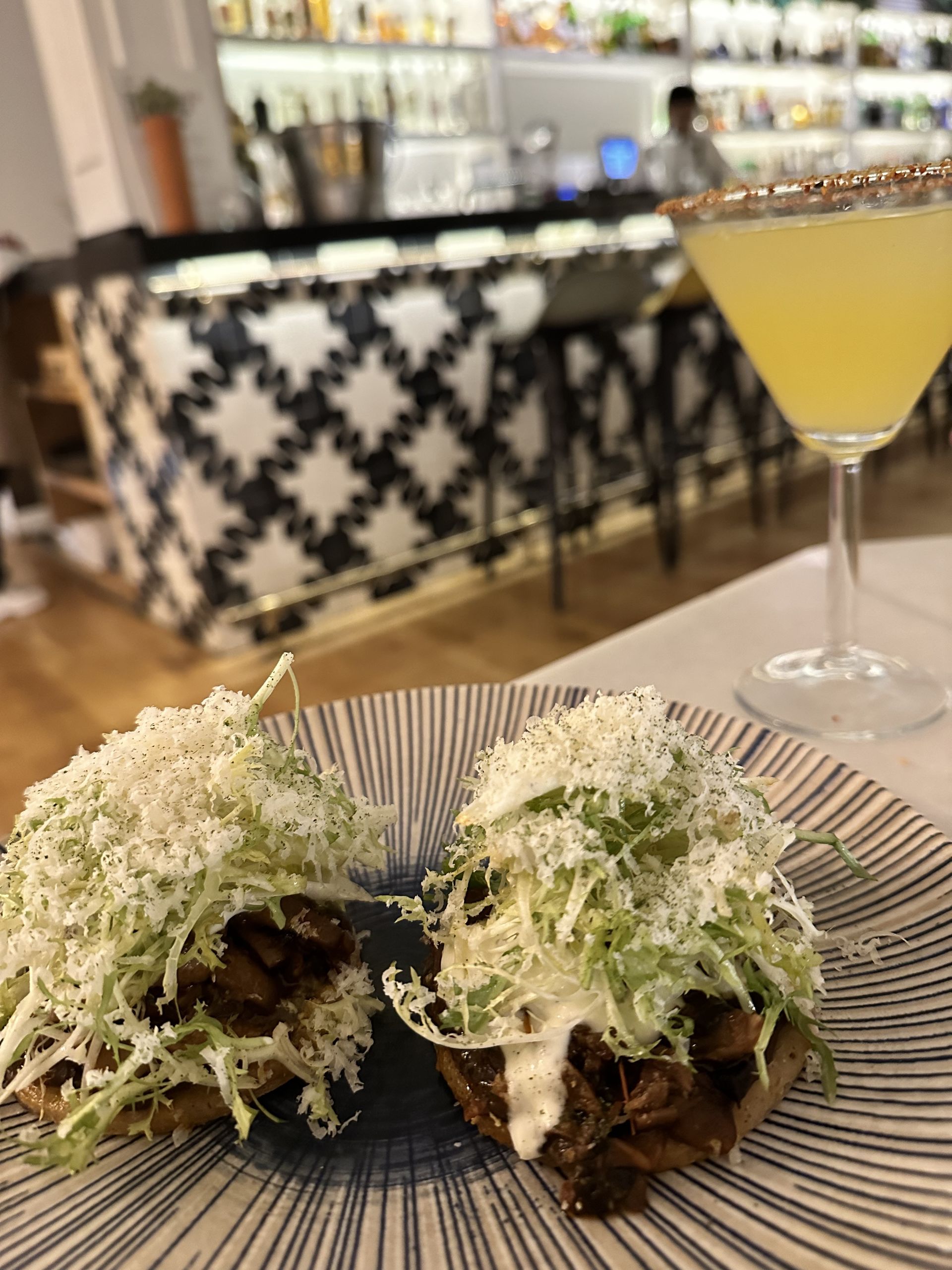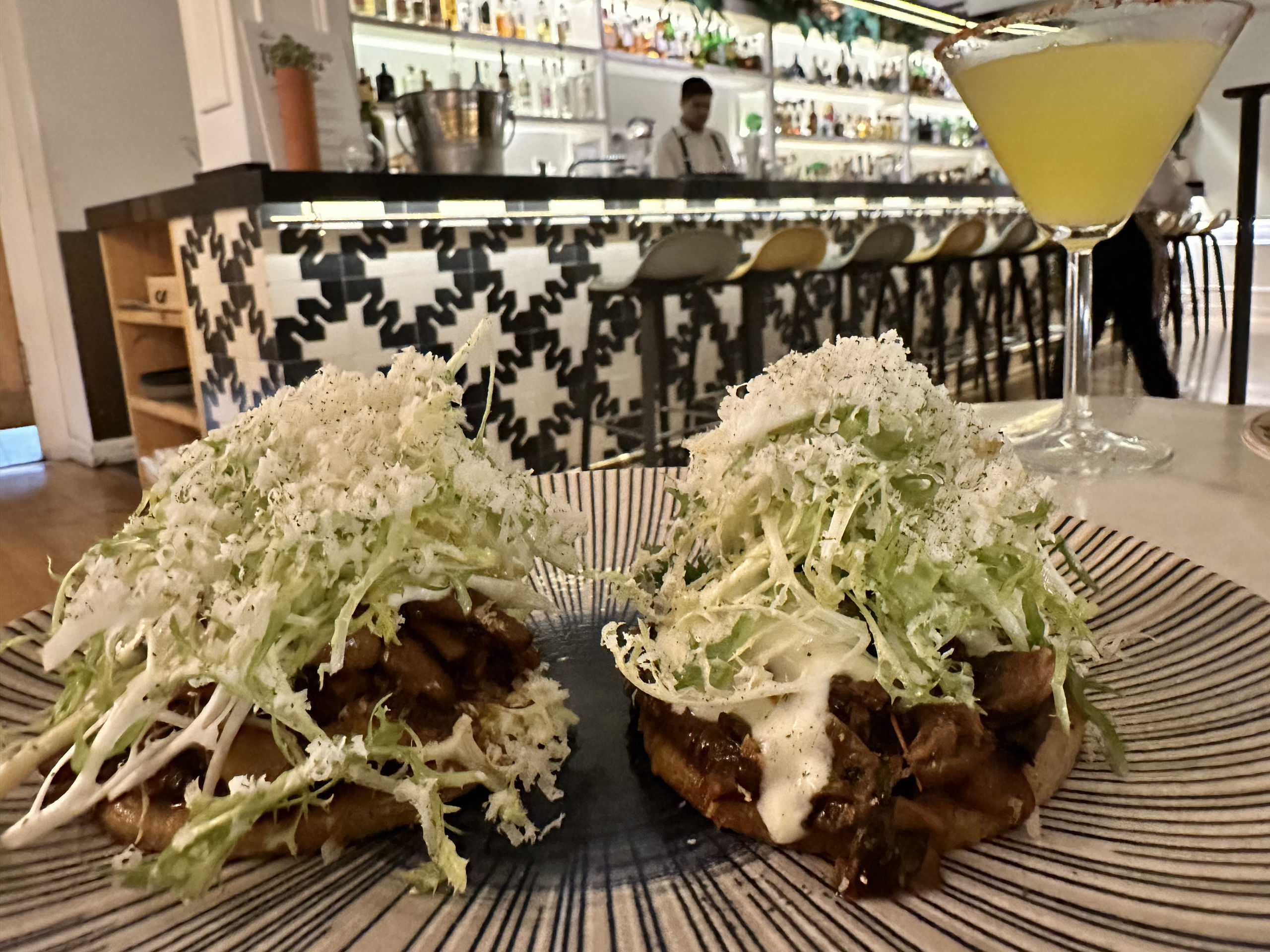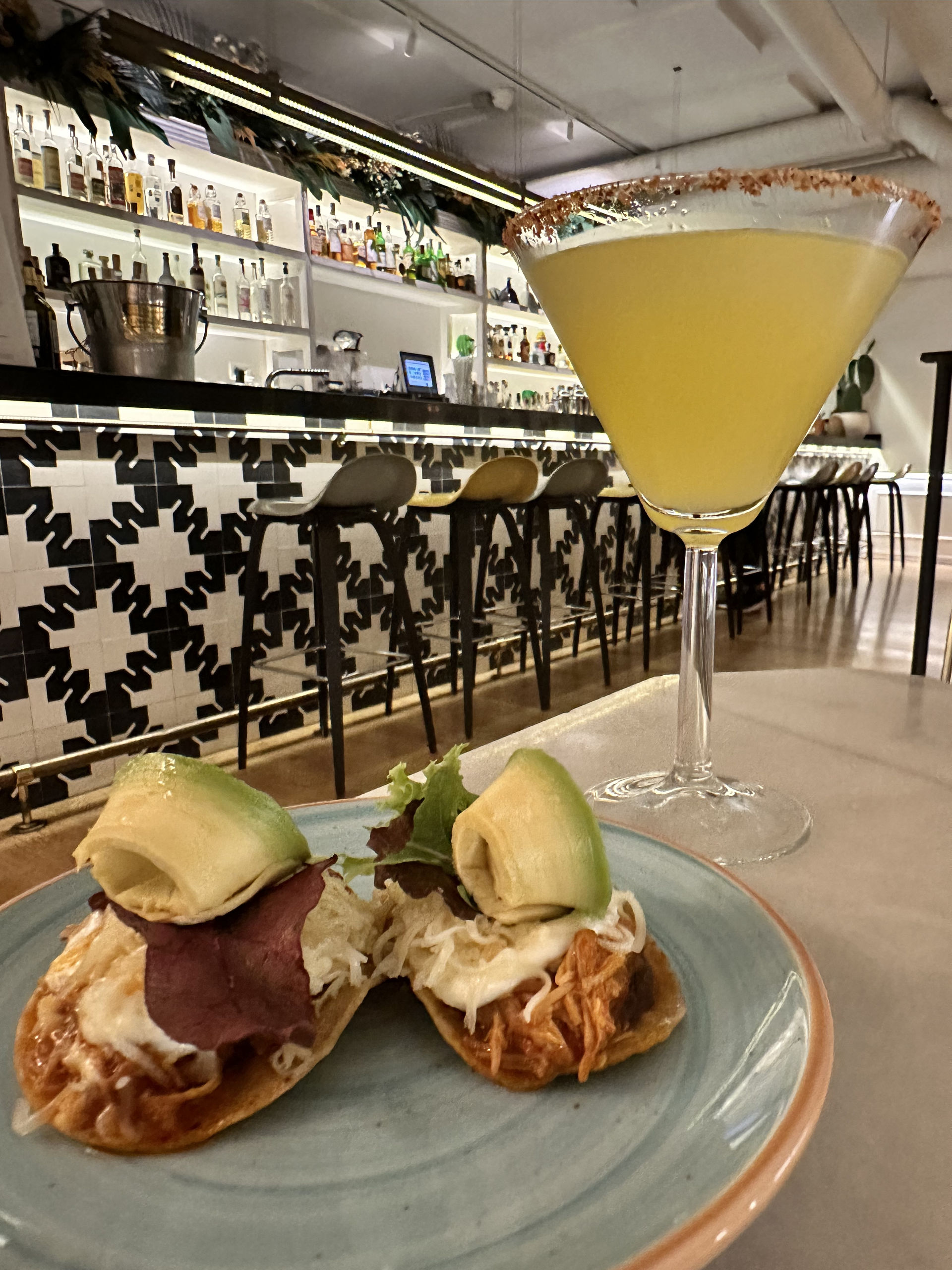 Deliciosas tostadas de tinga de pollo (14,50€), con pollo sazonado con tomate y un toque de chile chipotle sobre una crujiente tortilla de maíz, con frijoles refritos, queso, crema, aguacate y lechuga. Y la deliciosa margarita Tepic (10€).