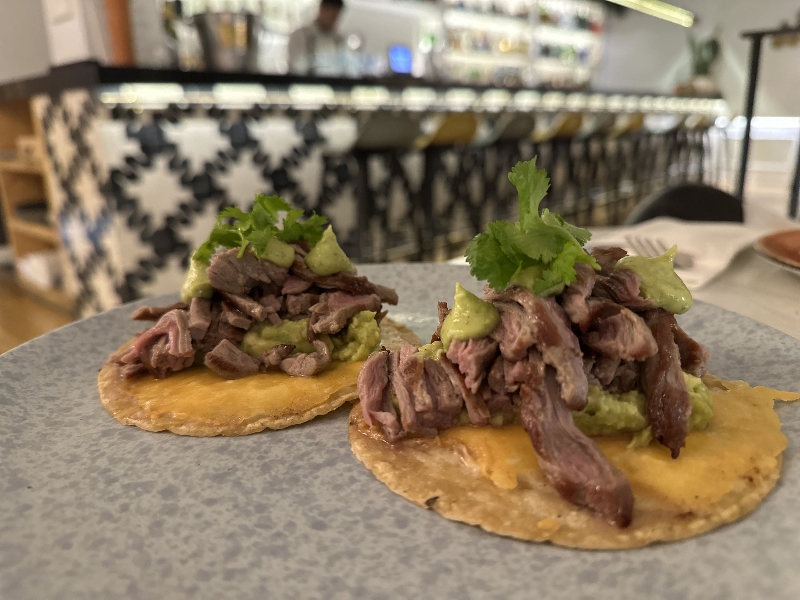 Exquisitos tacos Arrachera, con tortilla de maíz con costra de queso gouda, puré de aguacate que le da un toque más jugoso y una maravillosa entraña al punto.