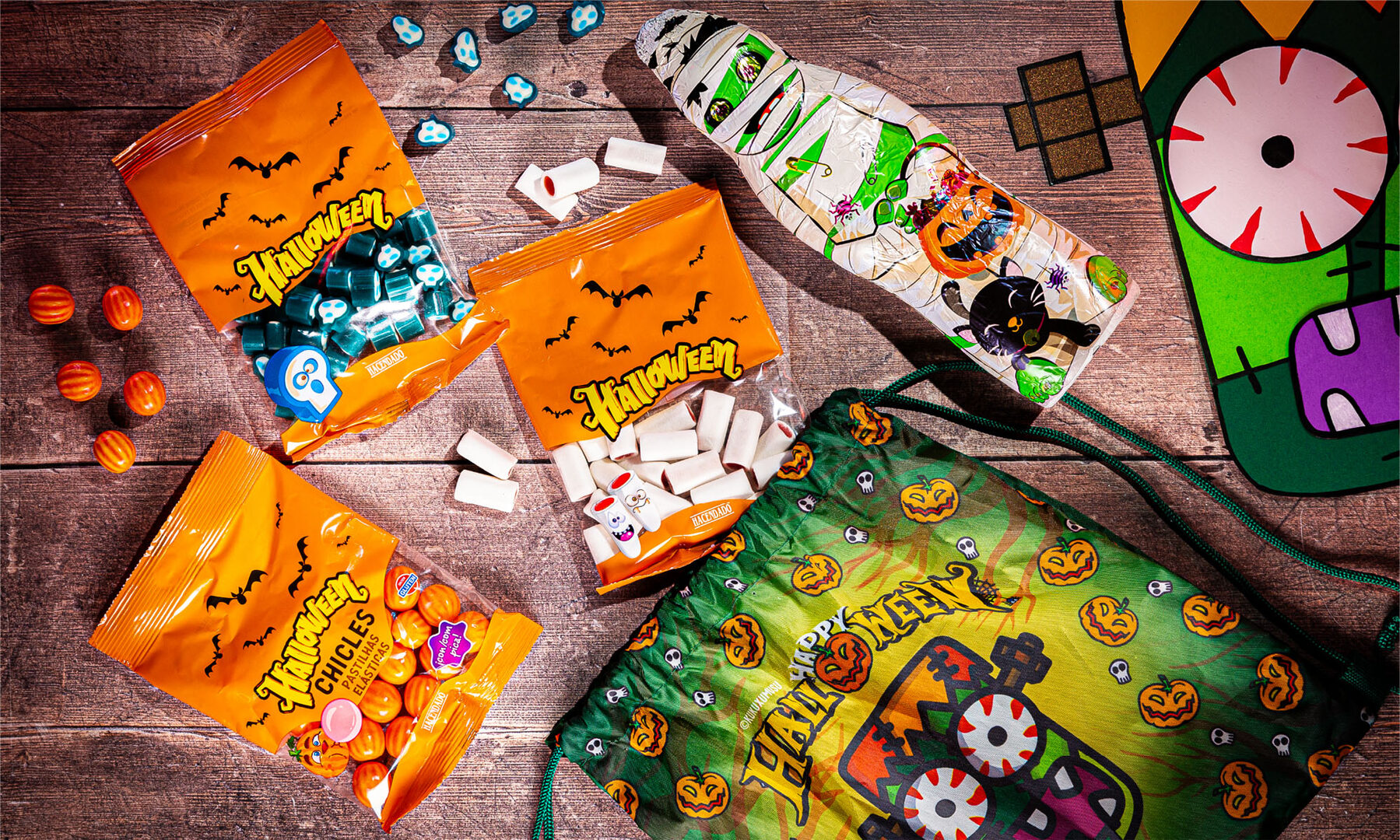 Para los más divertidos vuelven las Brochetas Halloween, cuatro modelos diferentes en forma de calabaza, zombie, fantasma y monstruo con sabor muy agradable y gran esponjosidad. Y en golosinas no podía faltar el ya tradicional Surtido Halloween, integrado por golosinas individualizadas de varias formas y sabores: chicles de melón, dentaduras, caramelos blandos pinta lenguas, piruletas, huesos y gusanos pica-pica y caramelos.