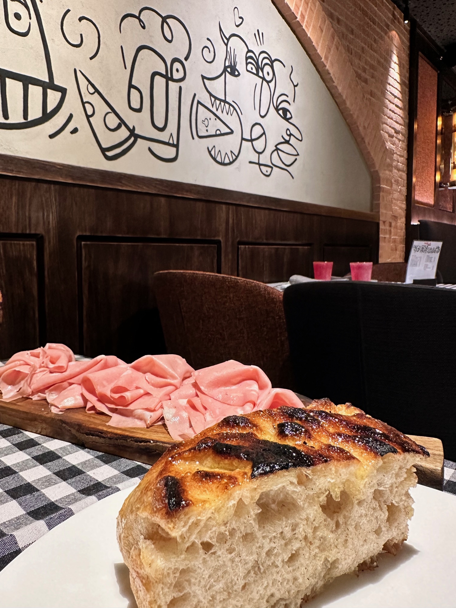 Extraordinaria mortadela cortado en "la Bekel". Y lo acompañan con una deliciosa fokacha casera, esponjosa por dentro y con un toque crujiente y casi caramelizado por fuera.
