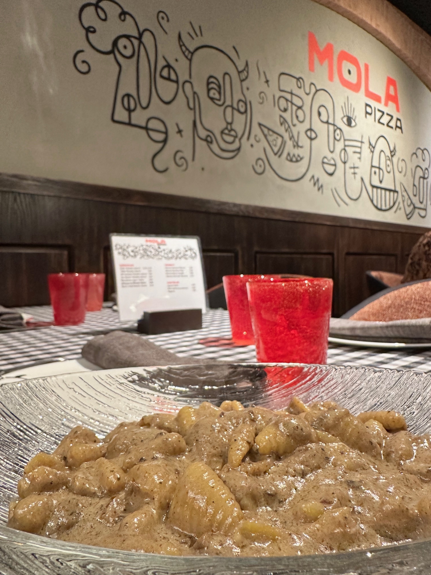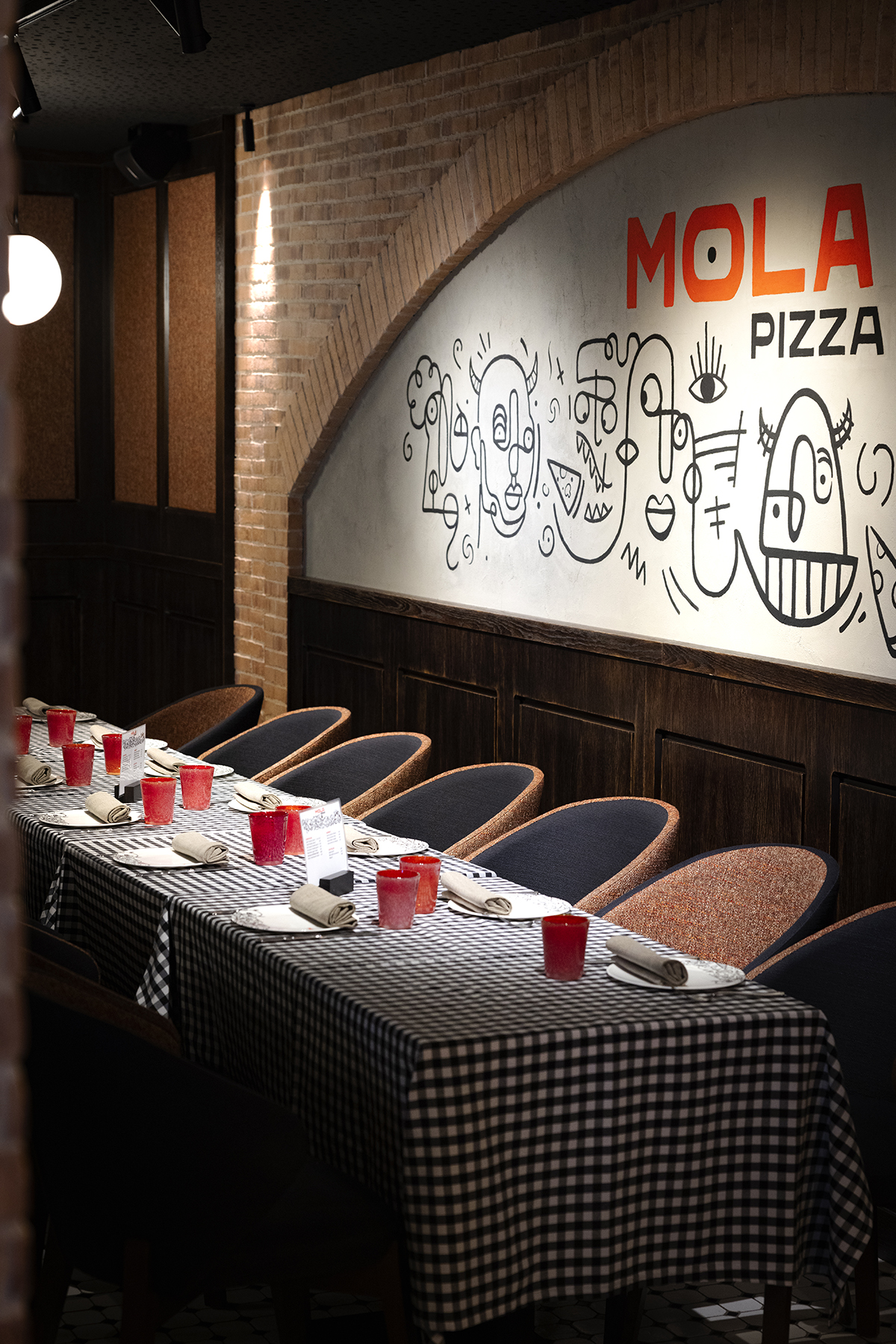 Su ladrillo visto contrasta con el mural cubista que preside la sala y unos amplios ventanales que te dejan ver la tranquila plaza en la que se ubica Mola Pizza –Plaza del Descubridor Diego Ordás, 3– y su amplia terraza.