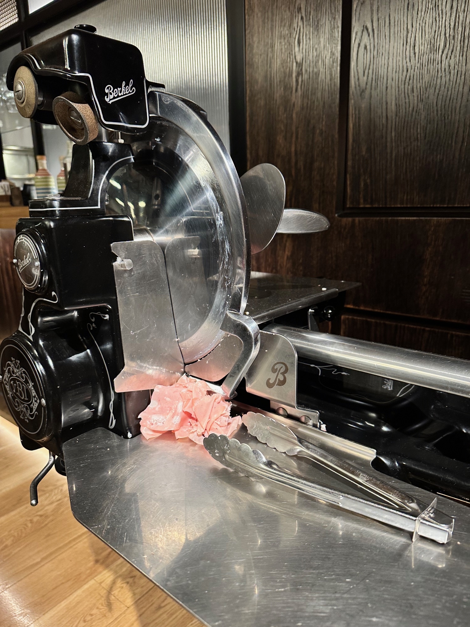 "La Bekel" es la majestuosa máquina que se levanta en una zona visible de la sala para que puedas ver el corte de su tradicional mortadela italiana.