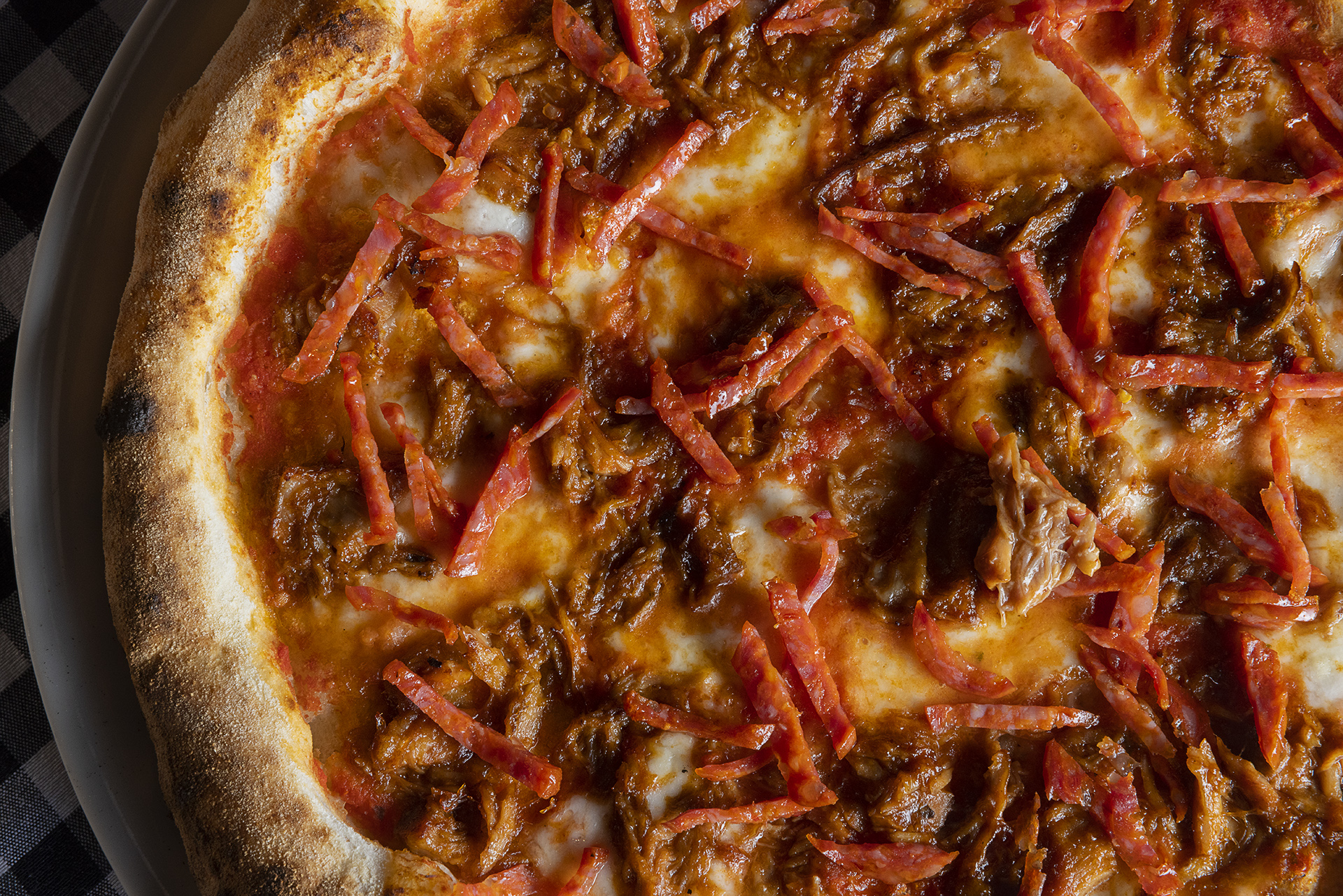 Buenísima la pizza de costillas asadas, BBQ y salami picante, mucho más contundente y de mayor sabor que la anterior pero las dos realmente buenas.