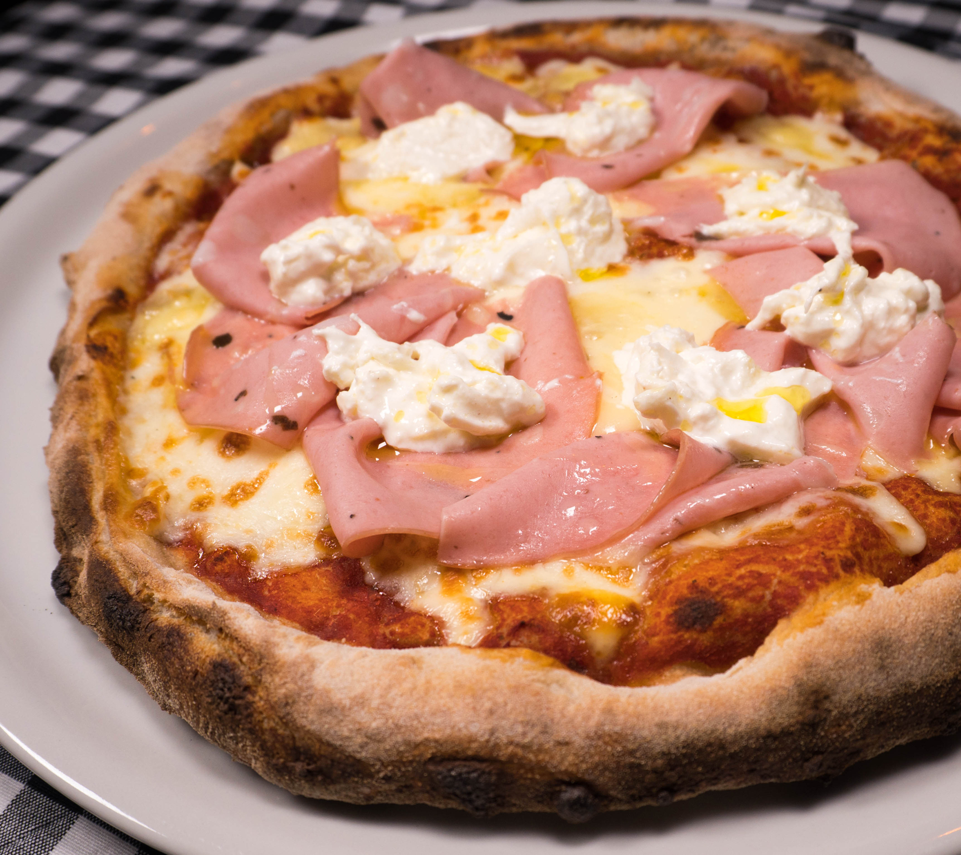 Una de las mejores pizzas que he comido en Madrid, la deliciosa pizza de Eloane, cuyo nombe es un homenaje a su hija y que tiene mozzarella, mortadela al tartuffo y stracciatella, que es el corazón de la burrata y que la da un toque jugosísimo a la pizza.