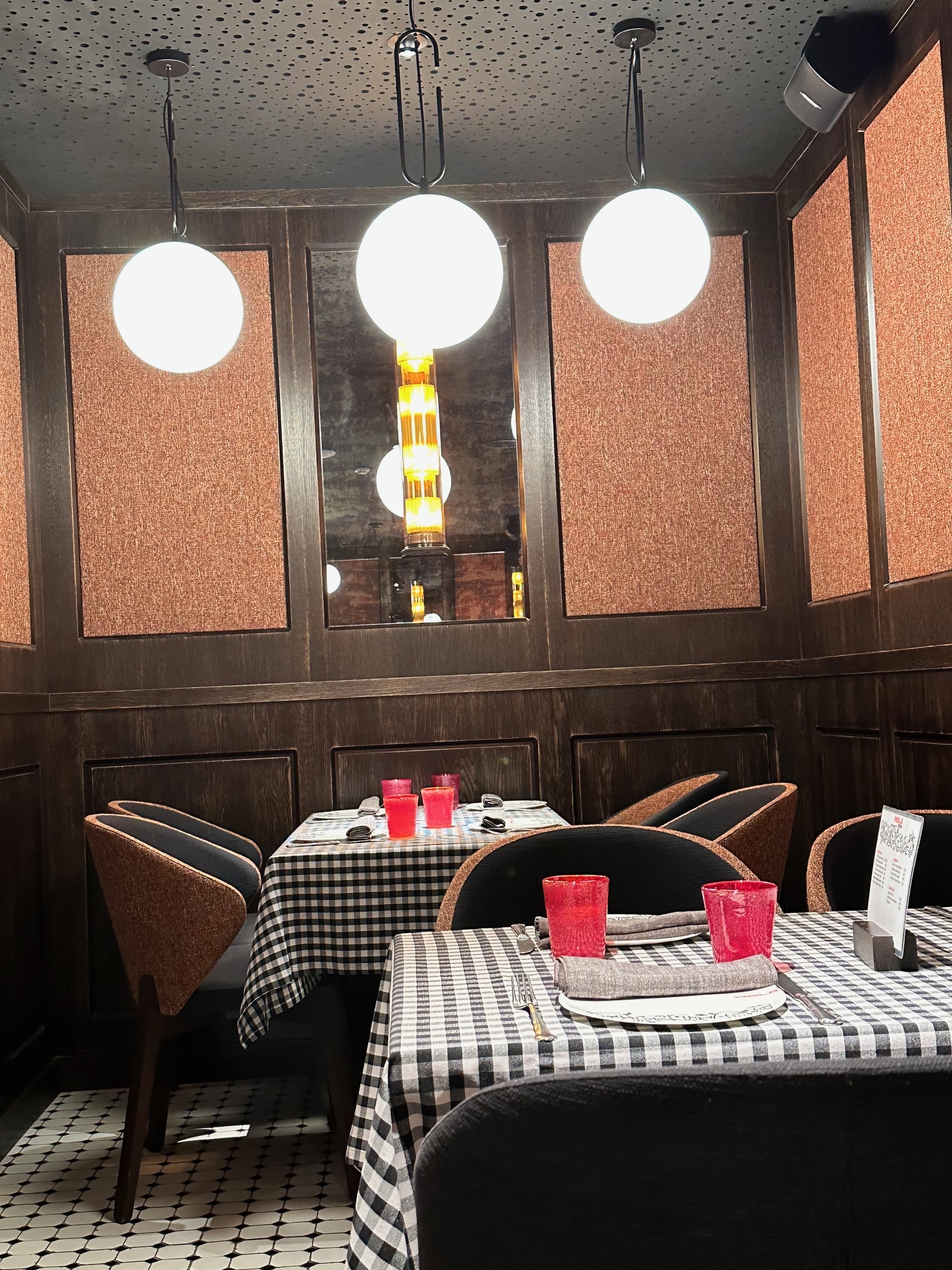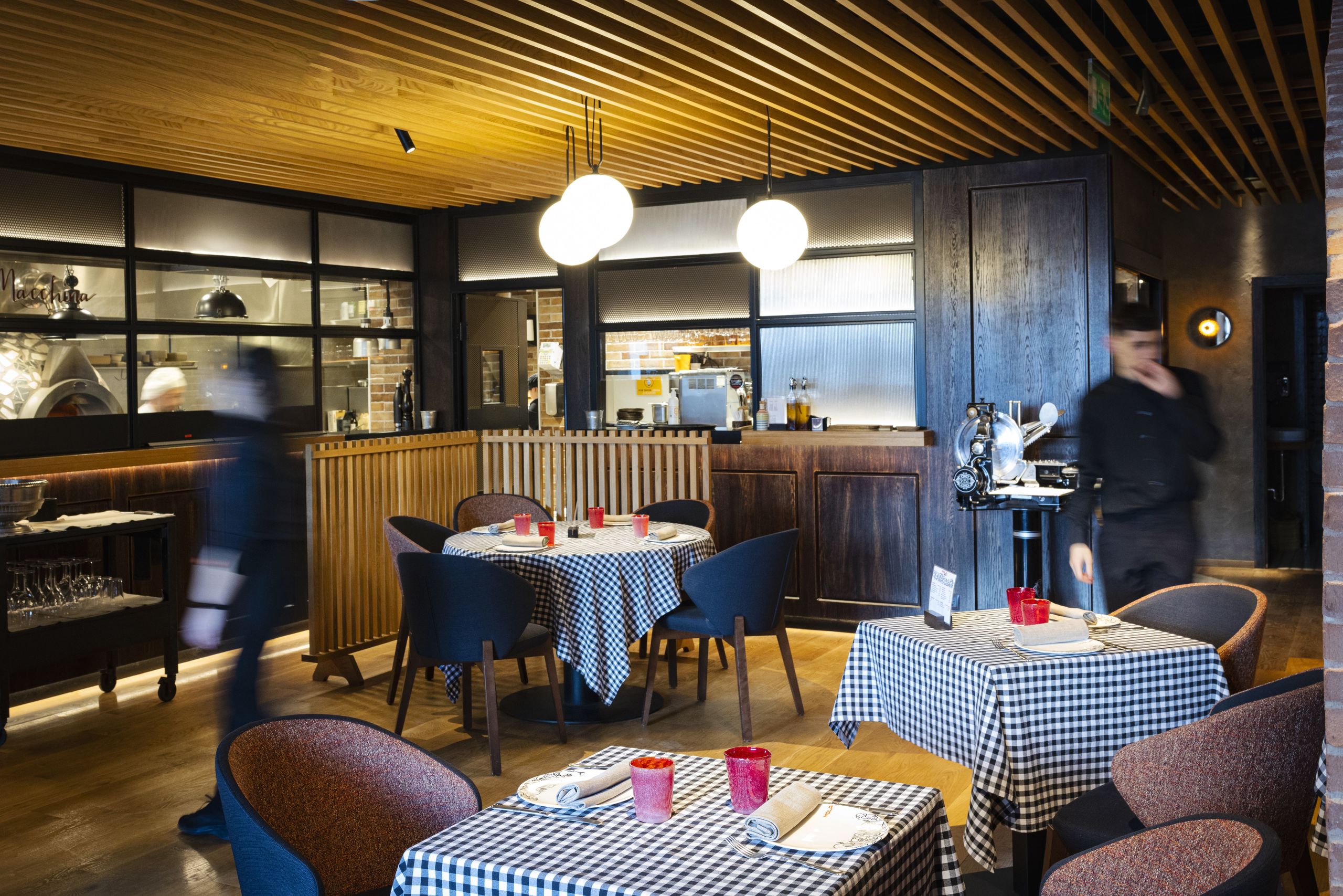La acogedora decoración que te hará sentir como en una típica trattoria italiana con sus manteles de vichy y sus lámparas.