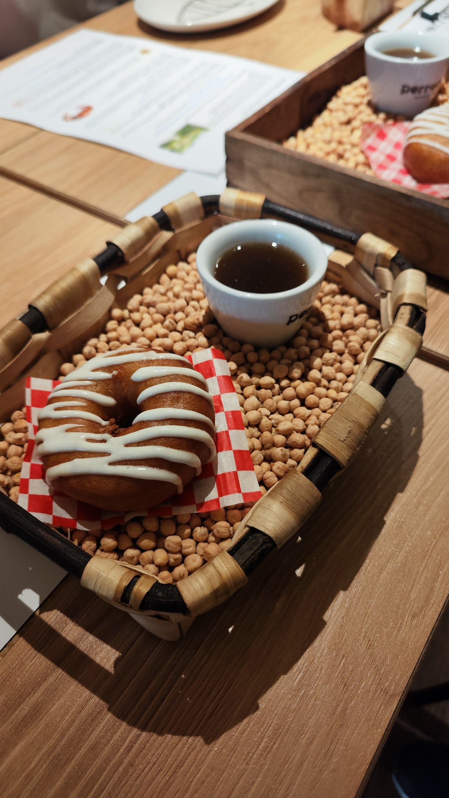 Dentro del donut te encontrarás el primer y segundo vuelco de un cocido tradicional y al lado tienes la tacita de caldo para acompañar el bocado.