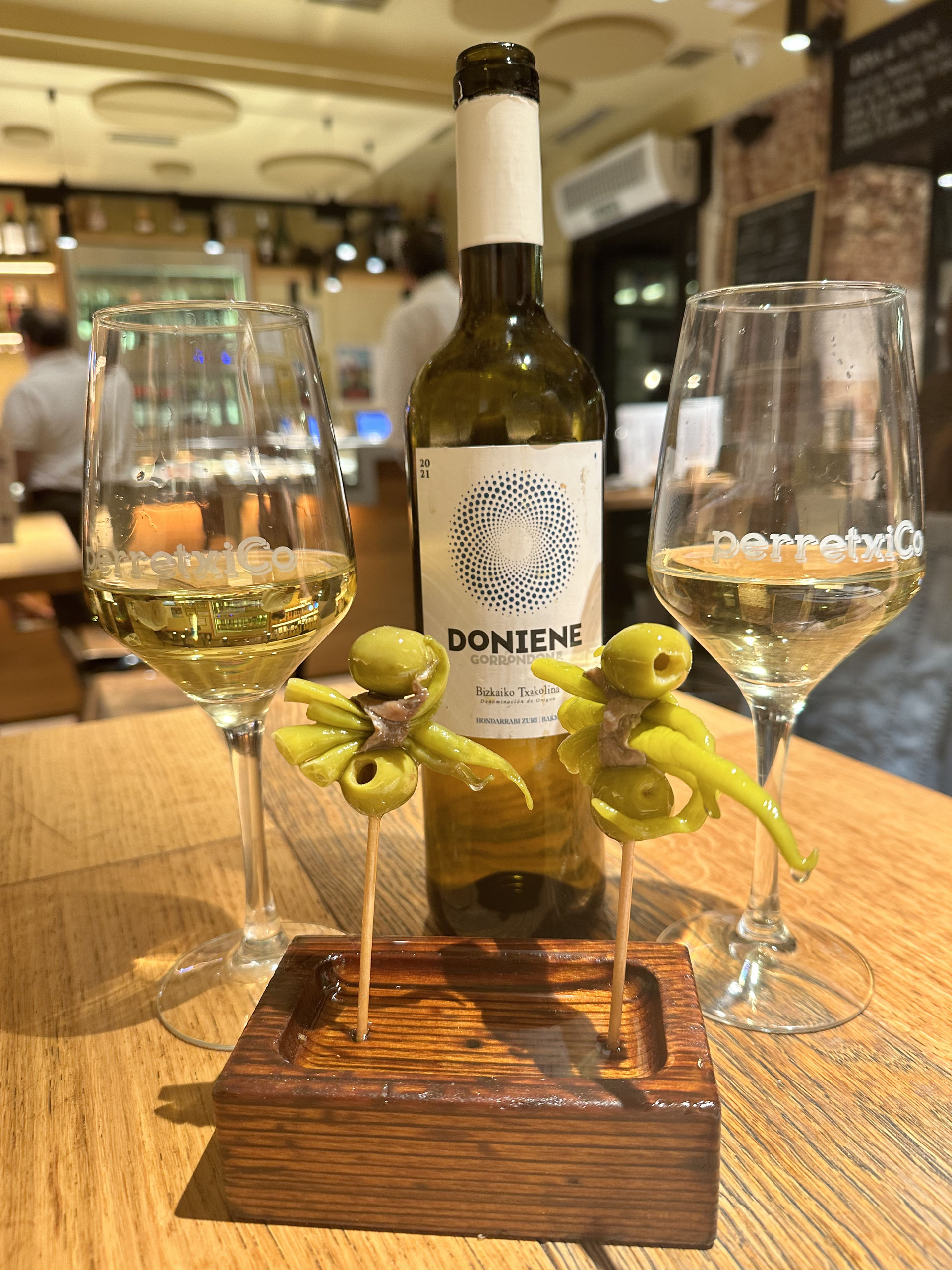 Formidables gildas de anchoa del Cantábrico, como mandan los cánones con aceituna, anchoa y piparras, acompañada de una botella de un buen txacolí de Doniene Gorrondona con DO Bizkaiko Txakolina.