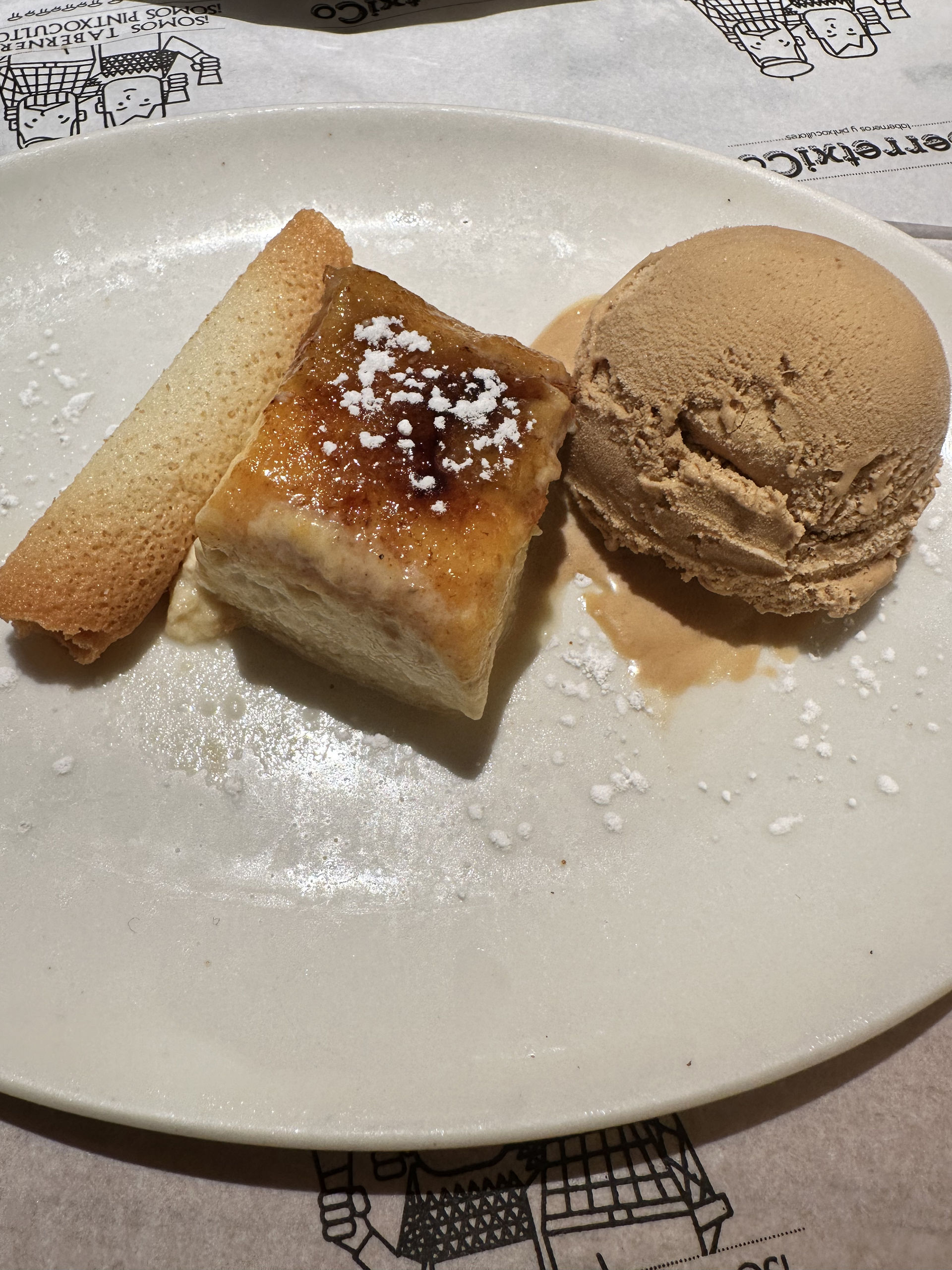 Buena torrija de brioche caramelizada empapada en nata fresca y helado.