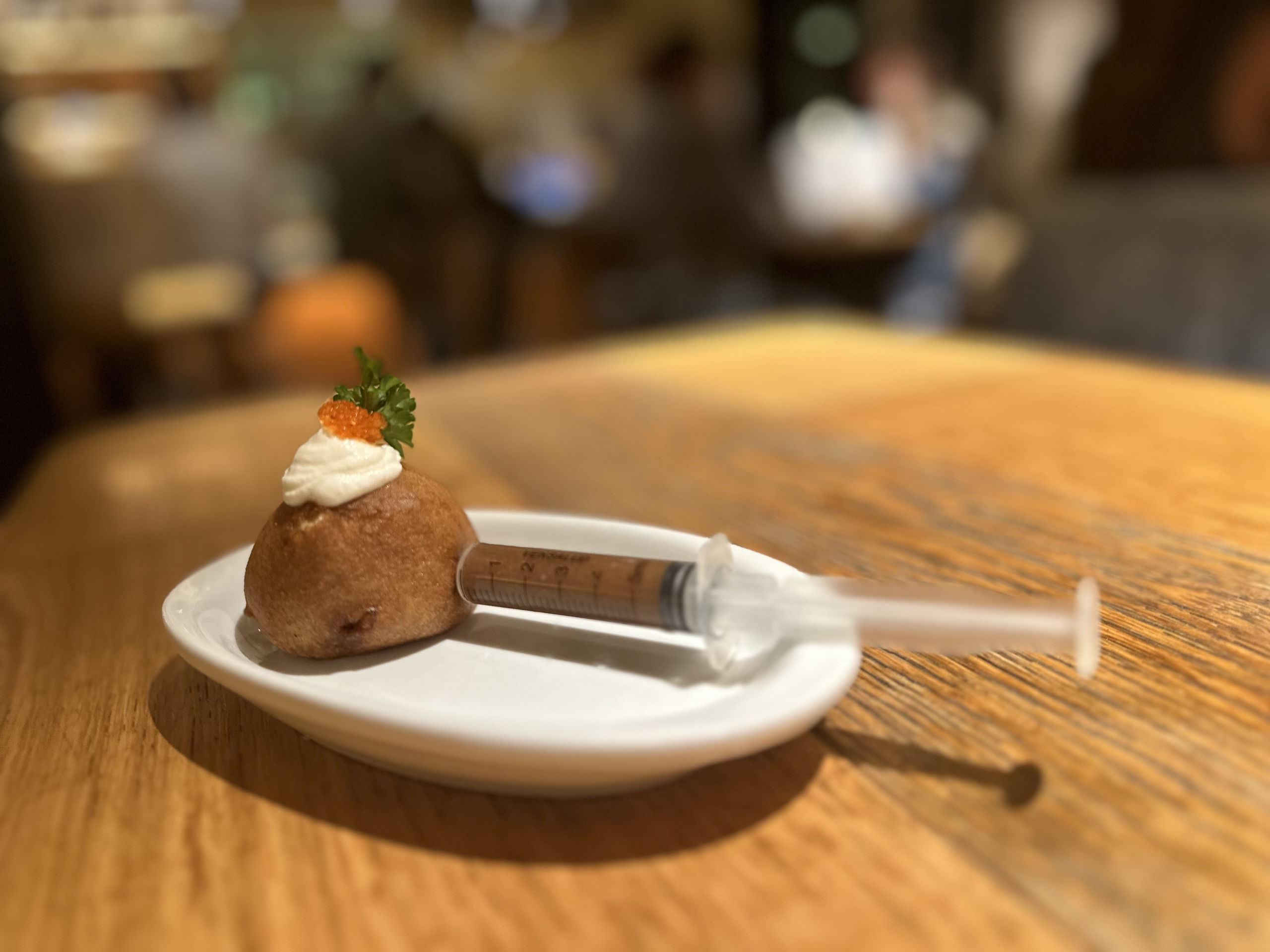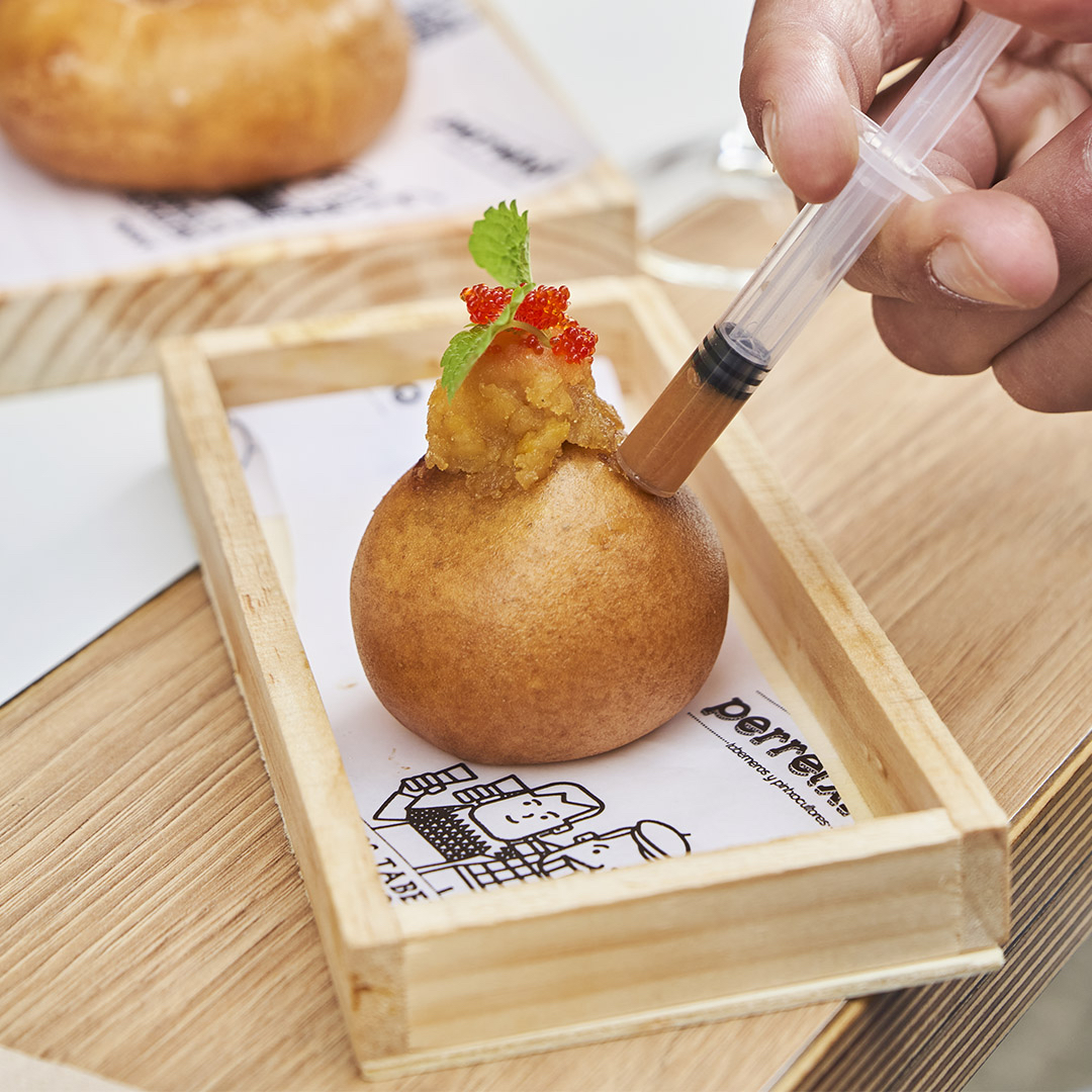 Sabrosísima Vacuna de laboratorios perretxiCo, un buñuelo de vacuno con jugo concentrado de carne, yogur y tobiko que tienes que infiltrar tú gracias a la jeringuilla que acompaña al buñuelo. Por algo este pintxo fue finalista del concurso de pinchos de Álava.