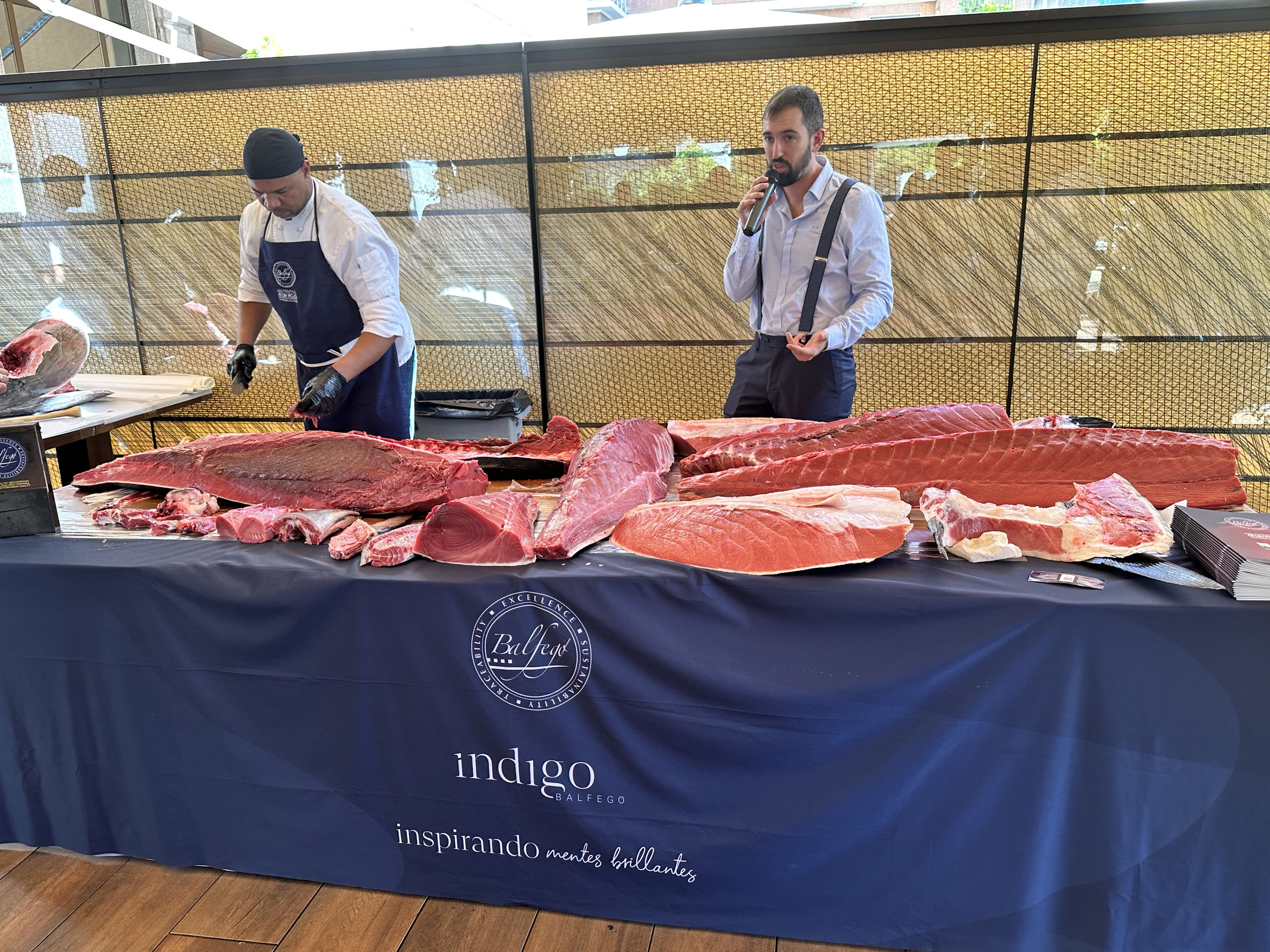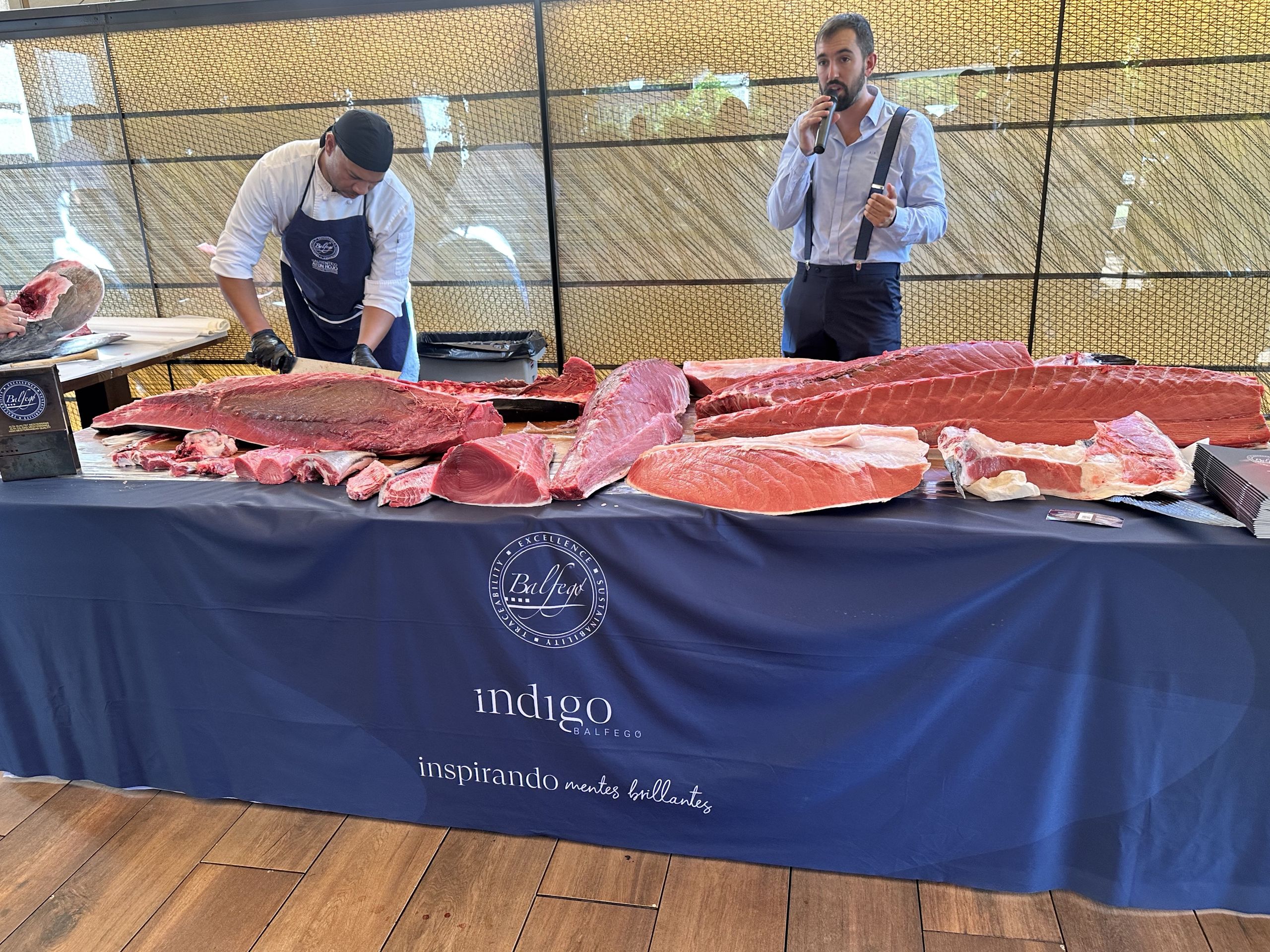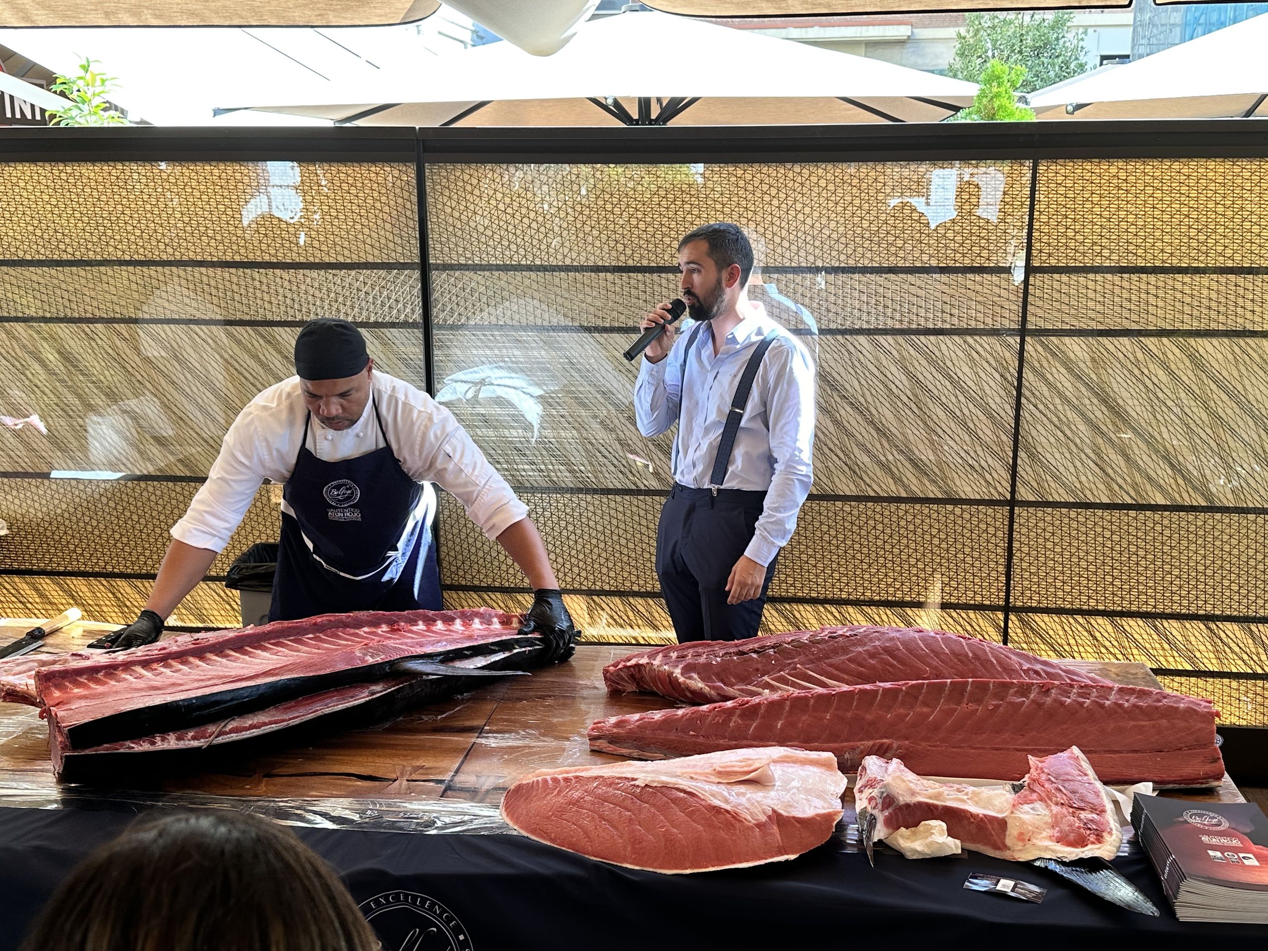 Joan Grau, director de Márketing y Ventas del Grupo Balfegó, hace de maestro de ceremona en el kaitai de este ejemplar de atún rojo Balfegó en el que se puede ver todas las partes que se aprovechan del túnico, un 92%.