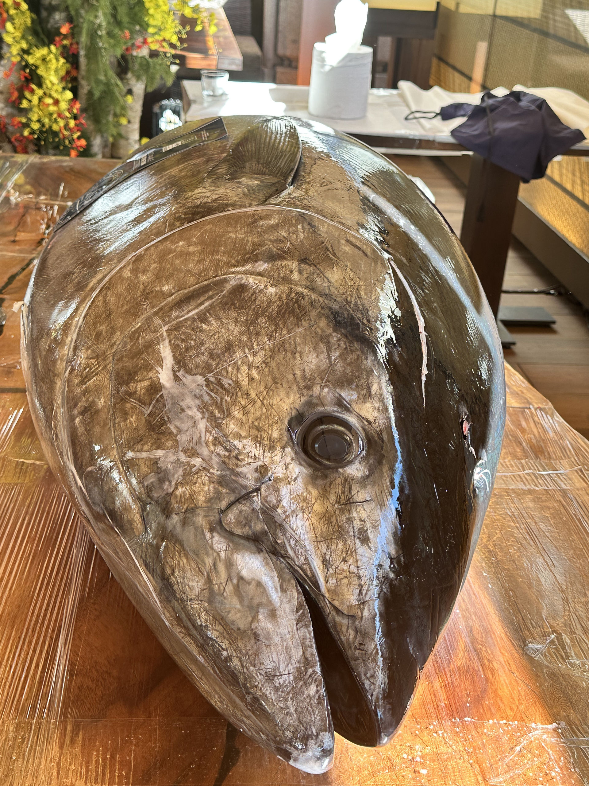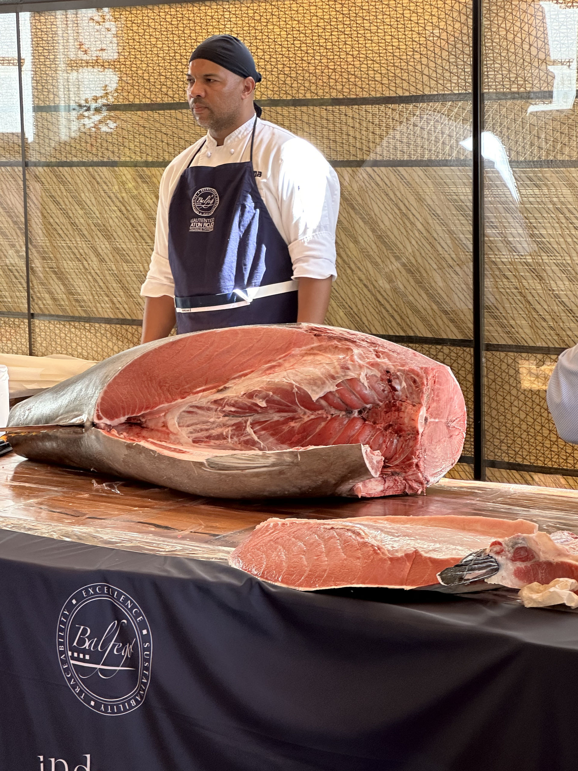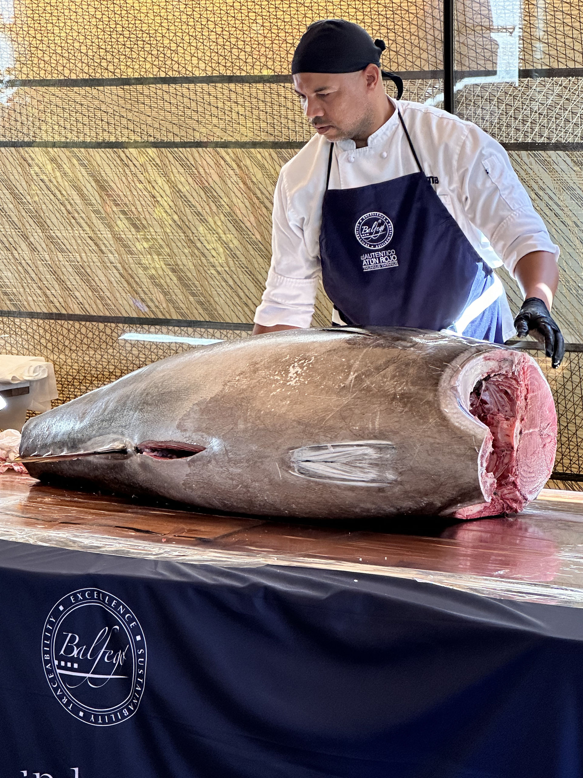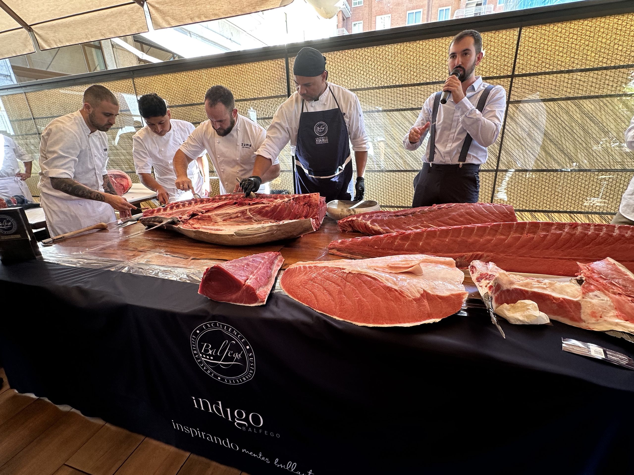 Joan Grau, director de Márketing y Ventas del Grupo Balfegó, hace de maestro de ceremona en el kaitai de este ejemplar de atún rojo Balfegó en el que se puede ver todas las partes que se aprovechan del túnico, un 92%.