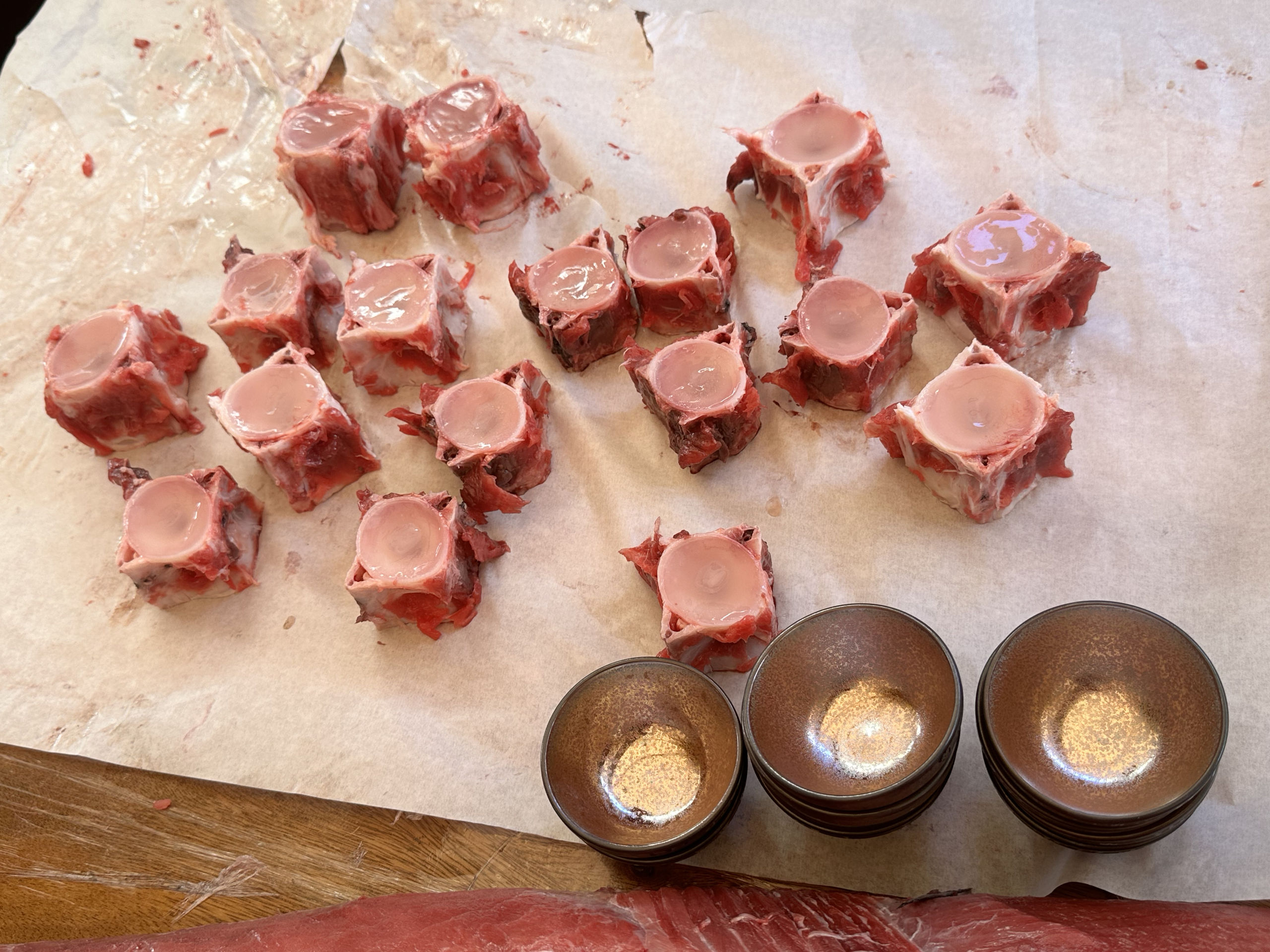 Comenzamos probando en crudo el hueso de la espina del atún, más concretamente la falsa médula, que es el líquido sinovial y que se usó por primera vez en el año 2003 en el restaurante El Bulli de Ferran Adrià. Es un producto de textura única, mucho más gelatinosa que una ostra y tiene un sabor más delicado. Requiere una cocción suave, como máximo escalfado, rebozado o frito. También es ideal para comer en crudo, en tempura o para elaborar en salsas.