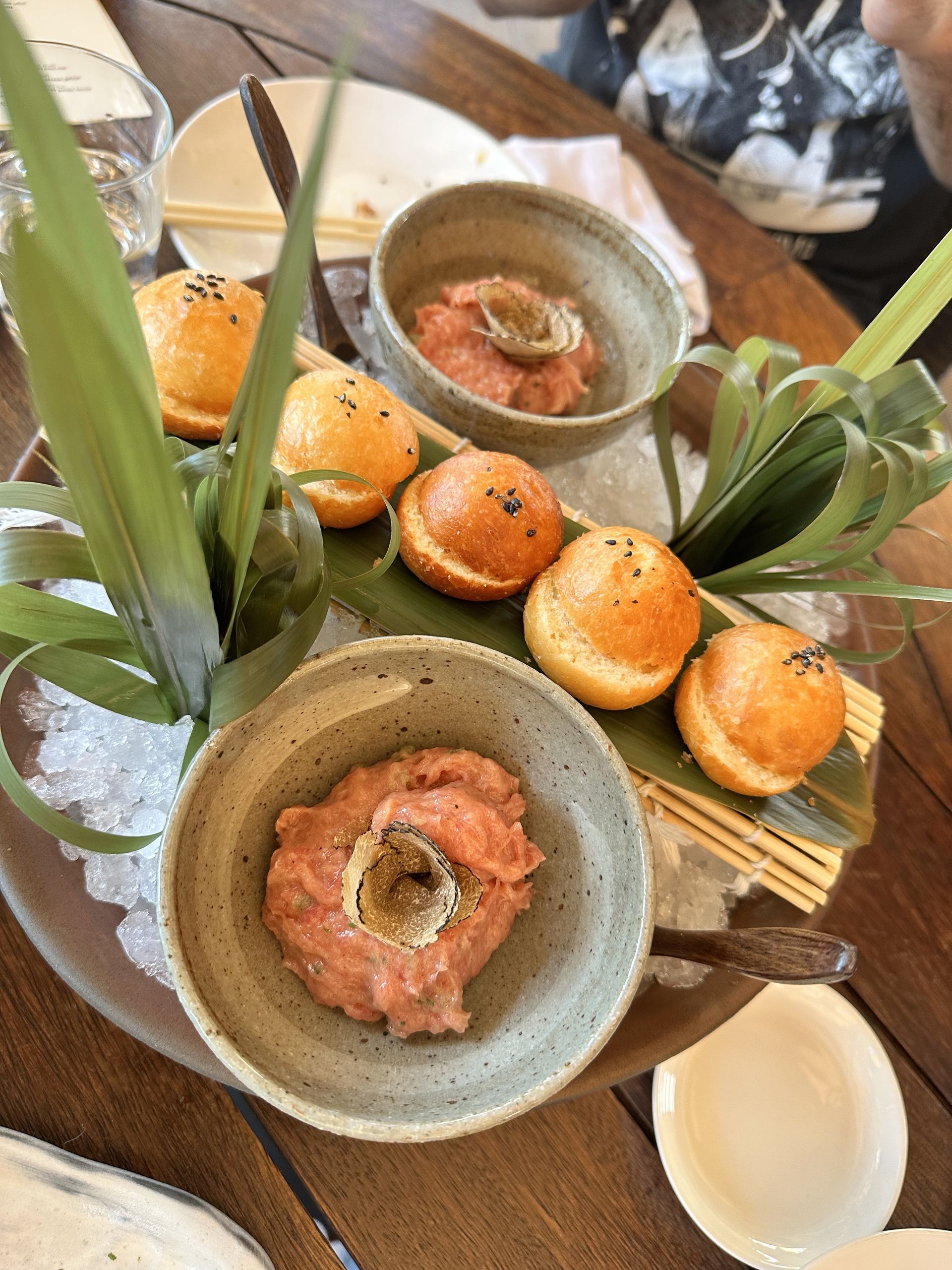 El festival de atún sigue con este impresionante tartar de chu toro con trufa y brioche de miso. El chu toro es una de las partes más grasas del atún por lo que resulta muy jugosa en tartar y la mezcla con la trufa y el briocho crujiente eleva este plano a un alto nivel.