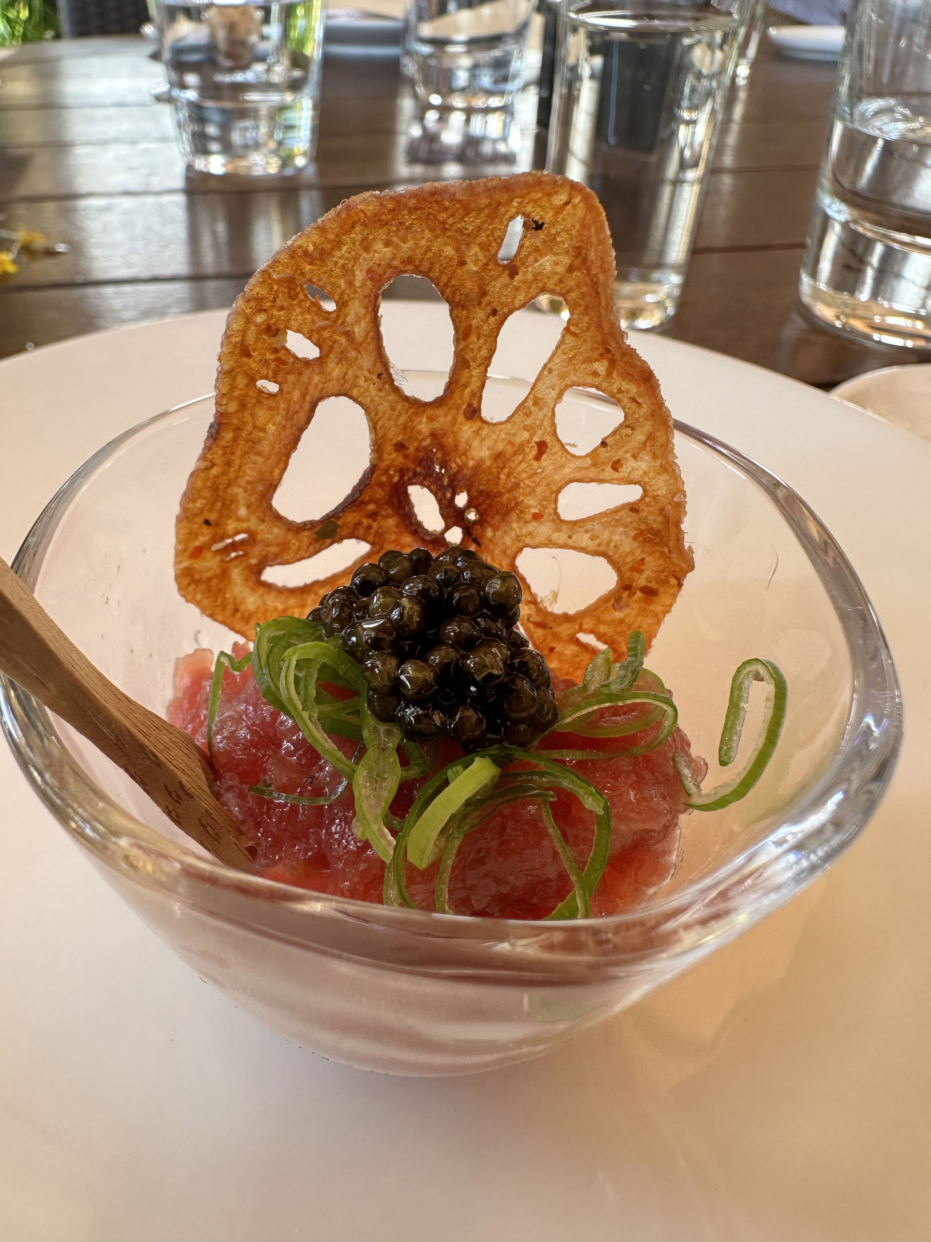 El resultado de sacar la carne que se ha quedado pegada a la espina tras separar los lomos y la ventresca es un maravilloso tartar, lleno de sabor, acompañado de cebolleta y caviar oscietra.